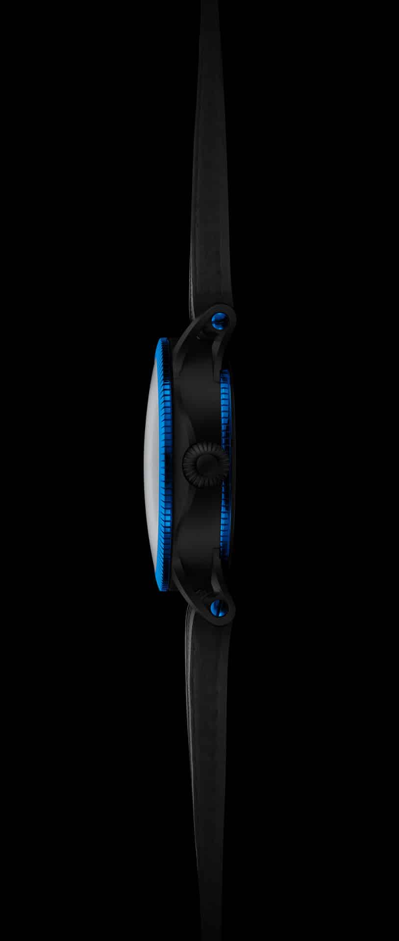 - Caja: 45 x 15 mm de acero inoxidable con DLC negro y CVD color azul; cristales de zafiro en ambas caras y corona tipo cebolla a rosca