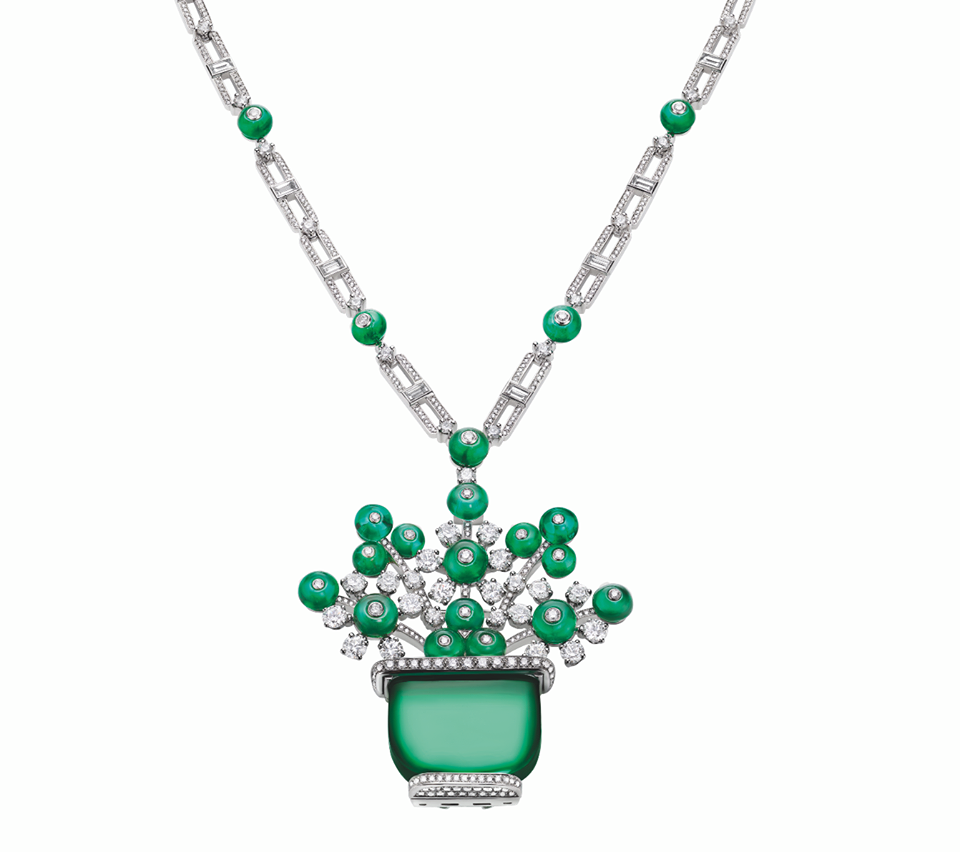 Por último, la combinación de zafiros en diferentes cortes, cada uno mayor a 12 quilates, se asientan en un tesoro de gemas: 188 esmeraldas corte buff-top (5.51 ct), 200 zafiros corte buff-top (6.06 ct), 94 diamantes corte step (8.32 ct) y pavé de diamantes (9.18 ct), son algunos de los personajes principales de tan importante colección.