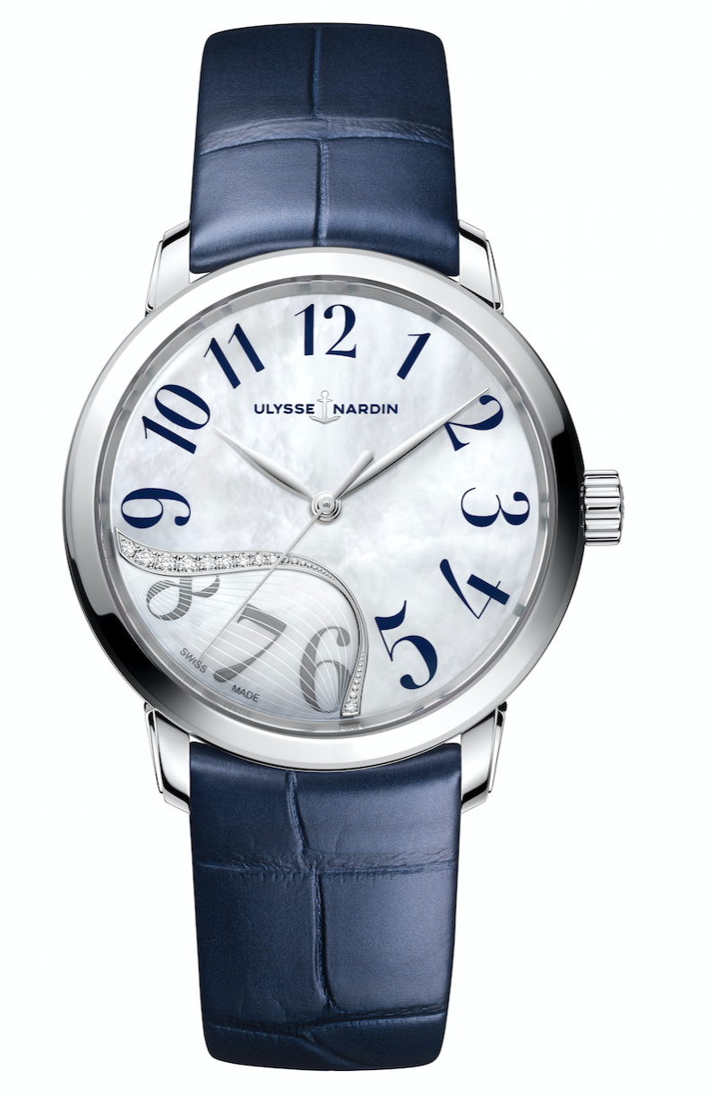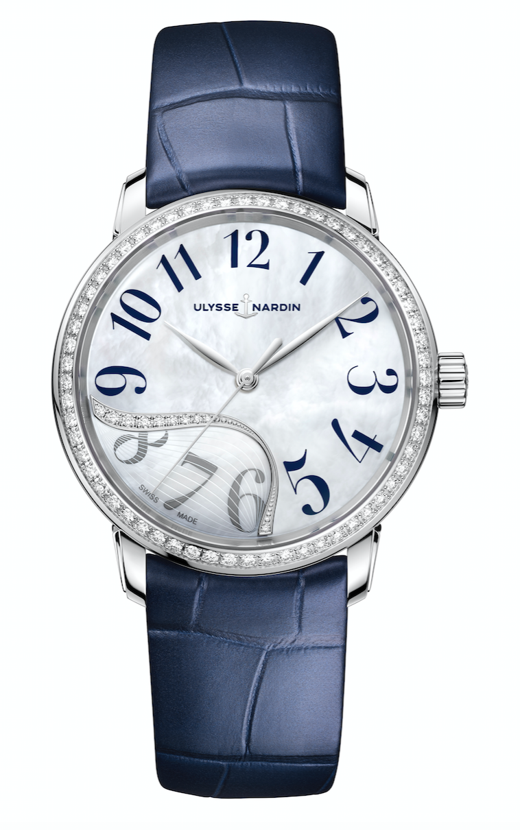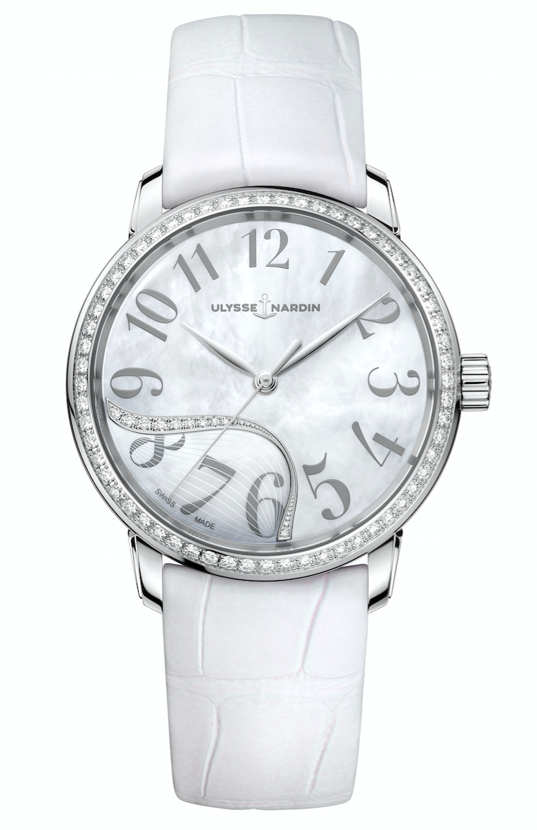 Sobre la carátula nácar en color blanco con número árabes en gris, azul o rojo se muestran las agujas clásicas de las horas, minutos y segundos que caracterizan a firma relojera. Su innovador diseño se resalta por el engaste de diez diamantes sobre una ola que adorna la parte inferior izquierda de la carátula. Sin embargo y si usted lo desea, está la versión que añade 76 diamantes en el bisel de acero inoxidable.