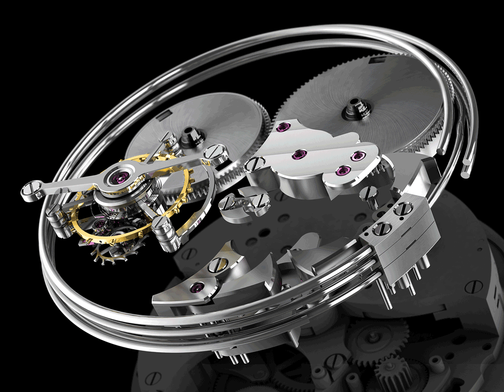 Surprise piece: se llama así porque se esconde entre las levas de cuartos y minutos, que rotan continuamente a diferencia de la de las horas que gira en incrementos. Sólo entra en acción para prevenir que la repetición regrese a la secuencia del principio.