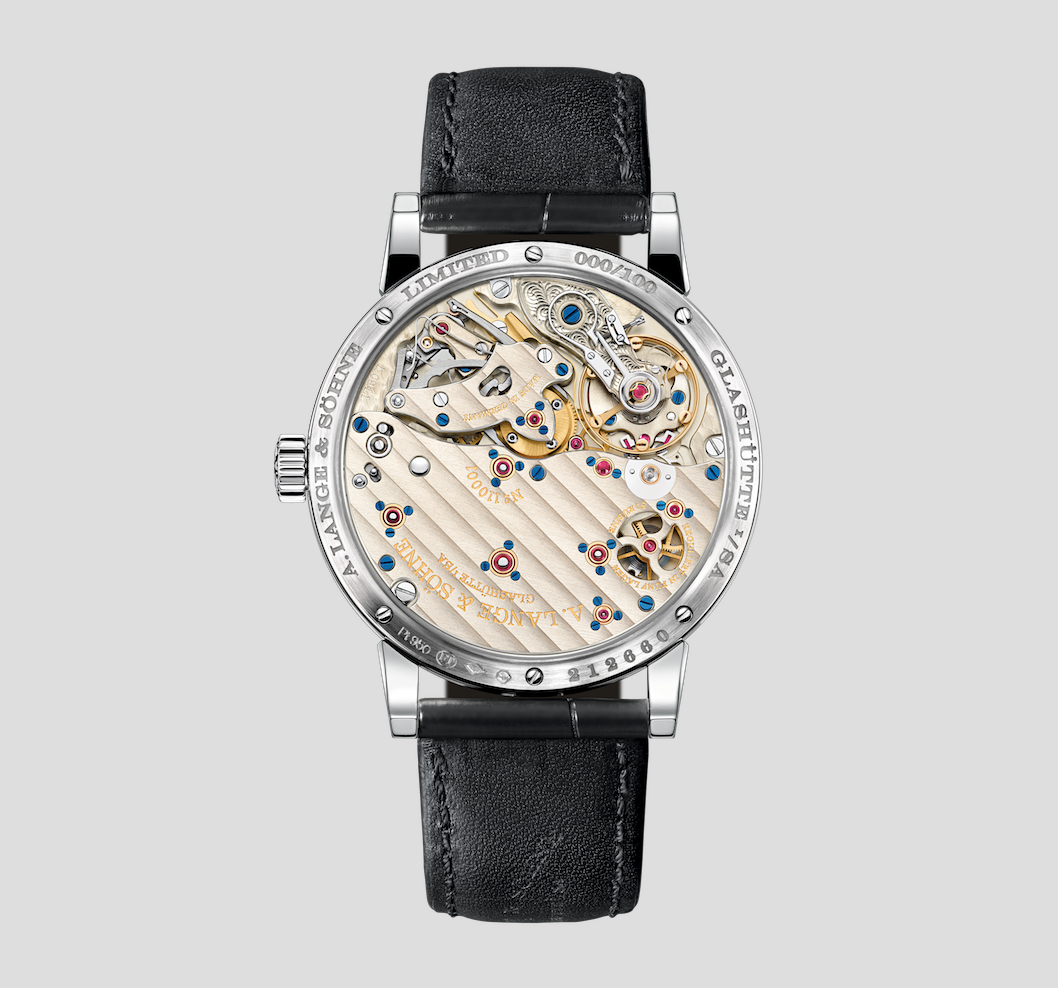 Para cerrar el acoplamiento y dejar libre de nuevo el volante, tan solo hará falta apretar la corona de nuevo y el mecanismo comenzará su marcha. Son 390 piezas las que componen el movimiento de cuerda manual de esta obra maestra de la precisión y la innovación relojera. Entre sus acabados –de Alta Relojería– incorpora puentes de alpaca natural (German silver) decorados con pulido de bandas de Glashütte, puente de volante grabado a mano, ocho engastes de oro atornillados y superficies acabadas con bruñidos y pulidos.