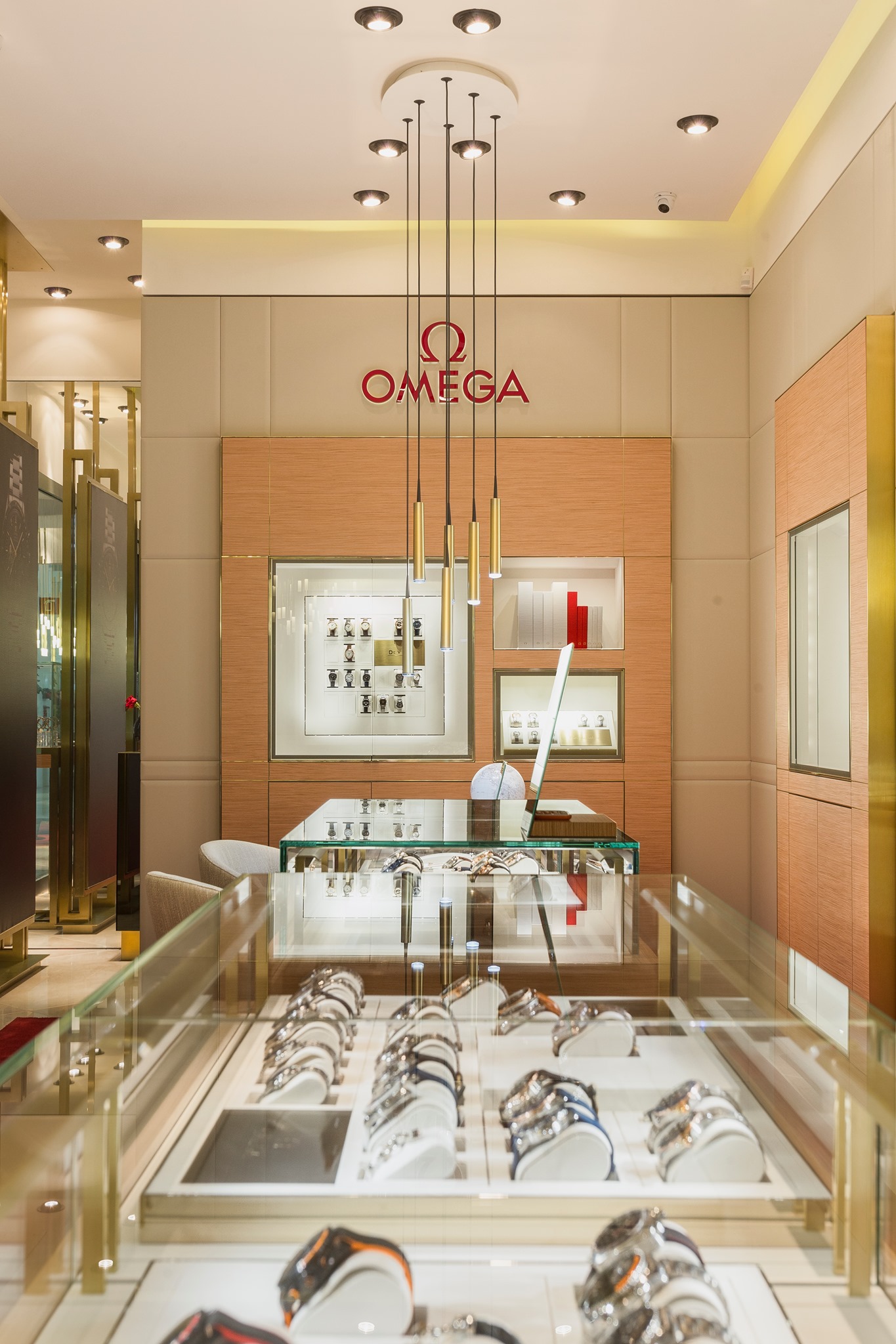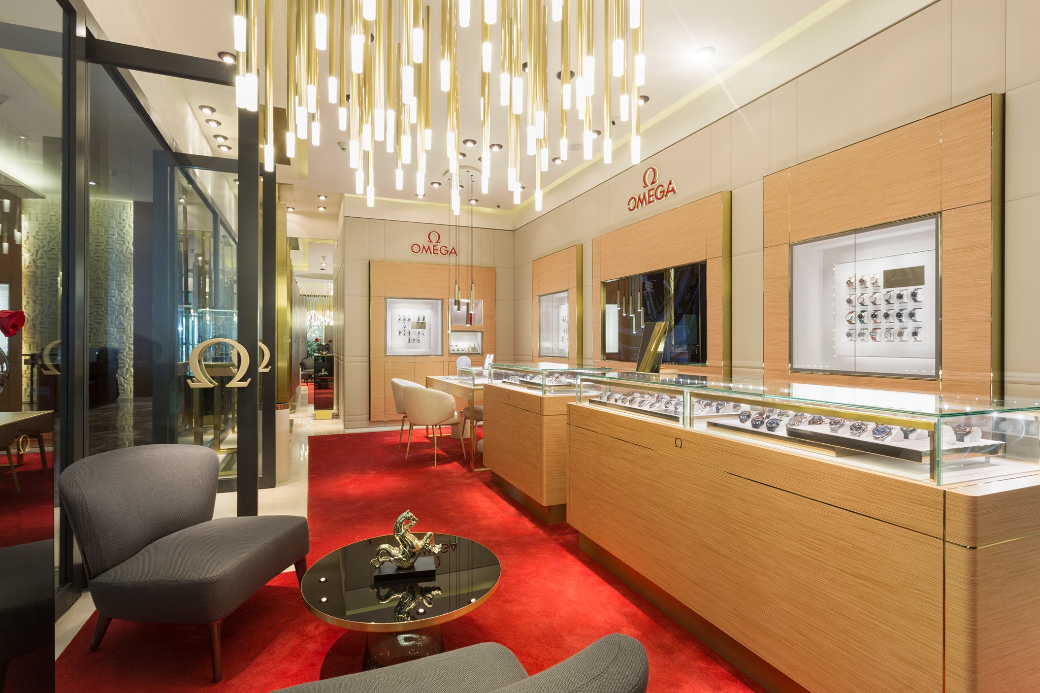 Las grandes innovaciones que ha presentado la marca fungen de inspiración para el nuevo concepto e imagen. Los elementos demuestran una estricta pasión por el detalle, con un fuerte reconocimiento a la imagen de la marca. Los códigos de color son neutros, destacados por el tono rojo, icónico color para los logos y la alfombra. La adecuación de la iluminación y decoración, permiten contar visualmente la historia de Omega.