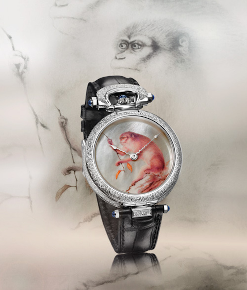 Integrante de la colección Mythical Journey, este reloj muestra un estupendo trabajo que resalta la figura del mono. Su caja de 38 mm en oro rosa de 18 quilates, está engastada con 78 diamantes corte brillante, mientras que la carátula, igualmente en oro de 18 quilates, luce un esmalte tabicado. Alberga al movimiento mecánico ultraplano de cuerda manual Manufactura Piaget 430P.