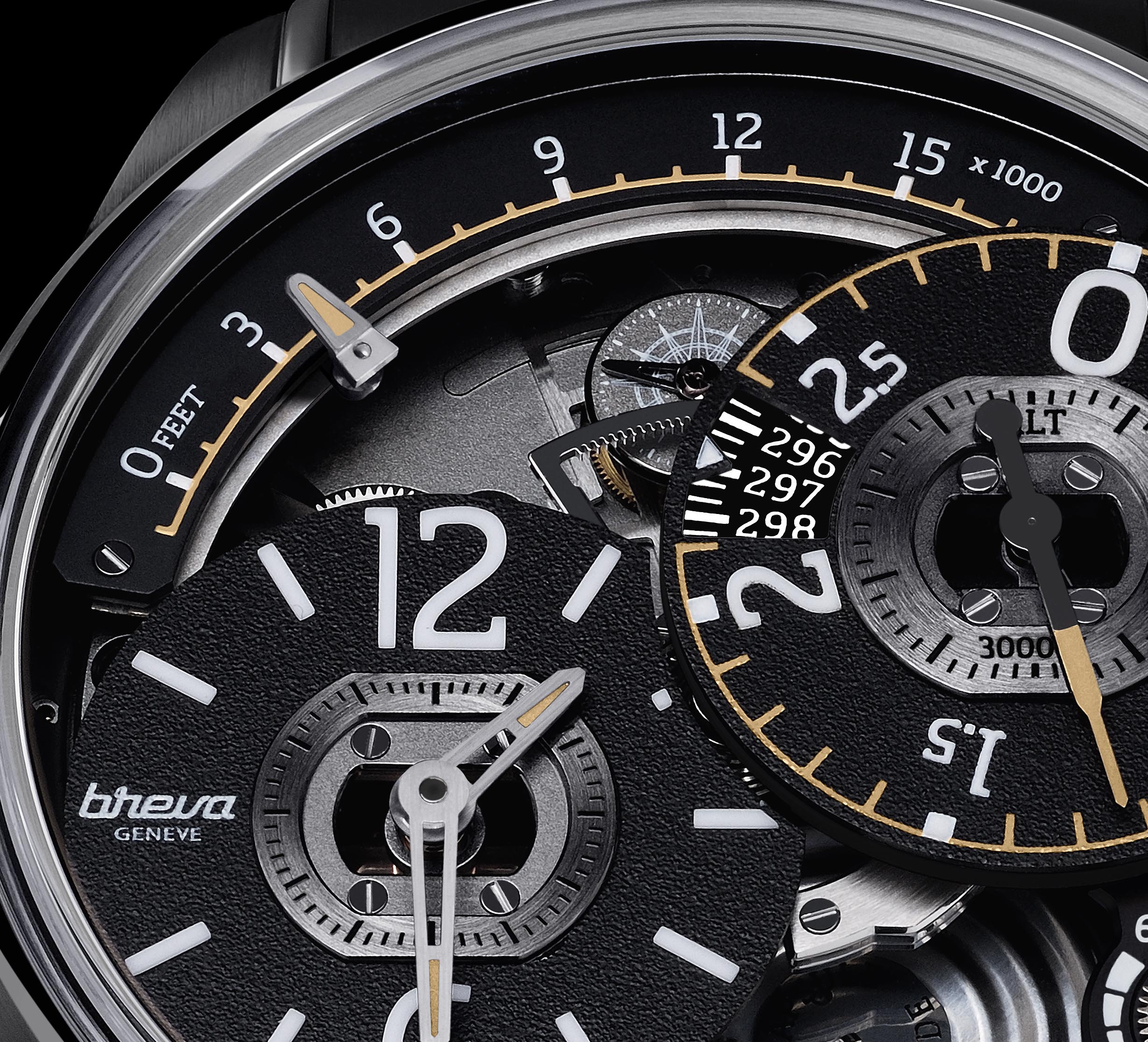 En un lugar destacado en la parte inferior de la carátula está una de las dos cápsulas aneroides que miden la presión atmosférica (de donde la altitud se deriva) gracias al brazo de alta precisión que multiplica por 200 la expansión y la contracción de las cápsulas obteniendo de esta manera las mediciones de altitud.