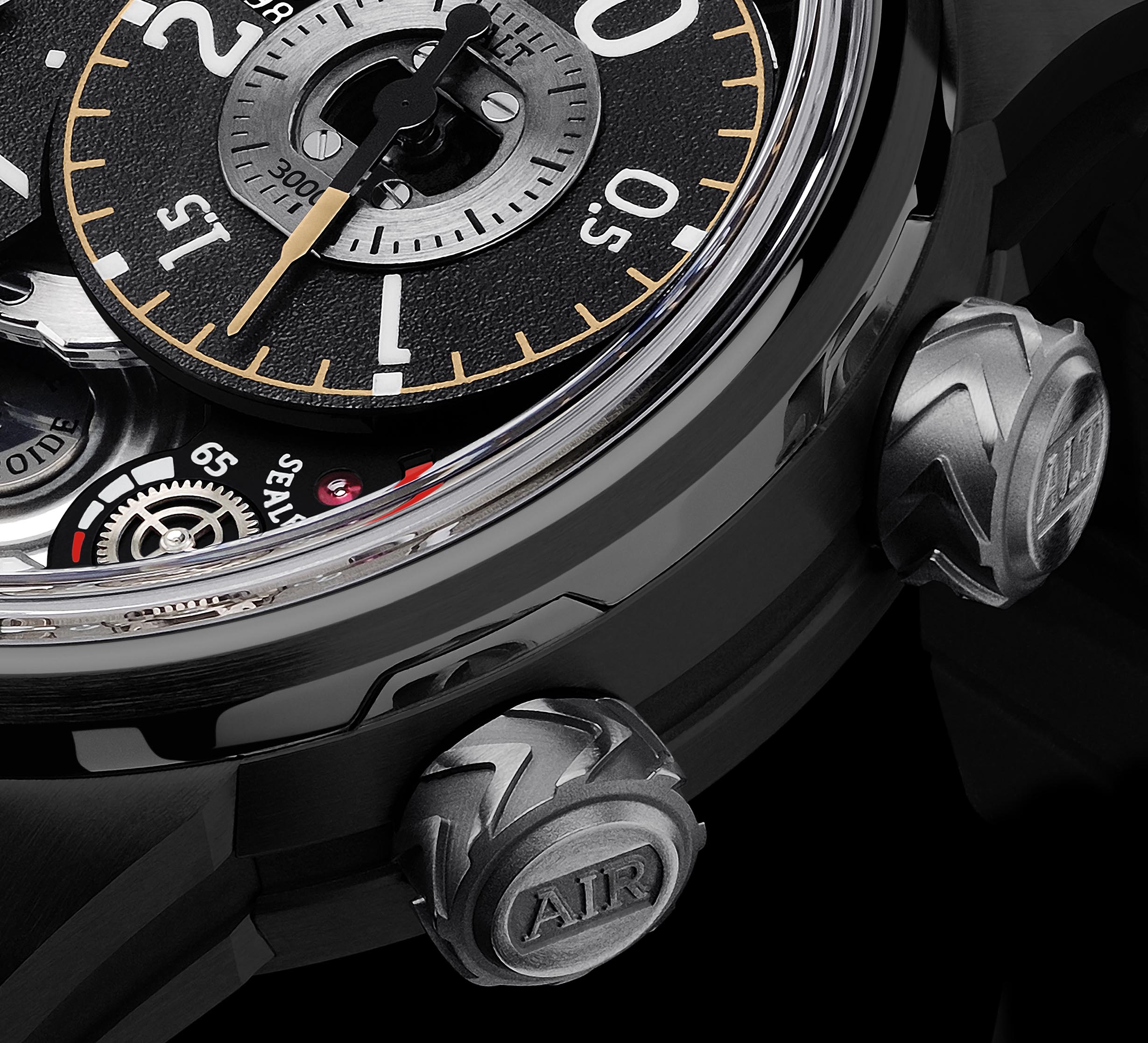 A través de tres coronas se ajustan y operan las funciones del Génie 02: la corona a las 9 horas tiene dos posiciones: una para dar cuerda al movimiento y la otra para el ajuste de la indicación de la hora. A las 2 horas una corona a rosca rota la gran escala y la escala de precisión de altitud para ajustarse en función de las variaciones en la presión atmosférica que afectan la lectura de la altitud. A las 4 horas una corona ligada a la válvula de aire permite dejar entrar el aire a la caja (para la función del altímetro). La fiabilidad y la longevidad del reloj son maximizados por medio de una membrana osmótica de Teflón que filtra cualquier rastro de humedad del aire antes de que entre en contacto con el movimiento. Por encima de la corona, una banda roja en la carátula marcada con “SEALED” (SELLADO) avisa cuando la válvula está desbloqueada.