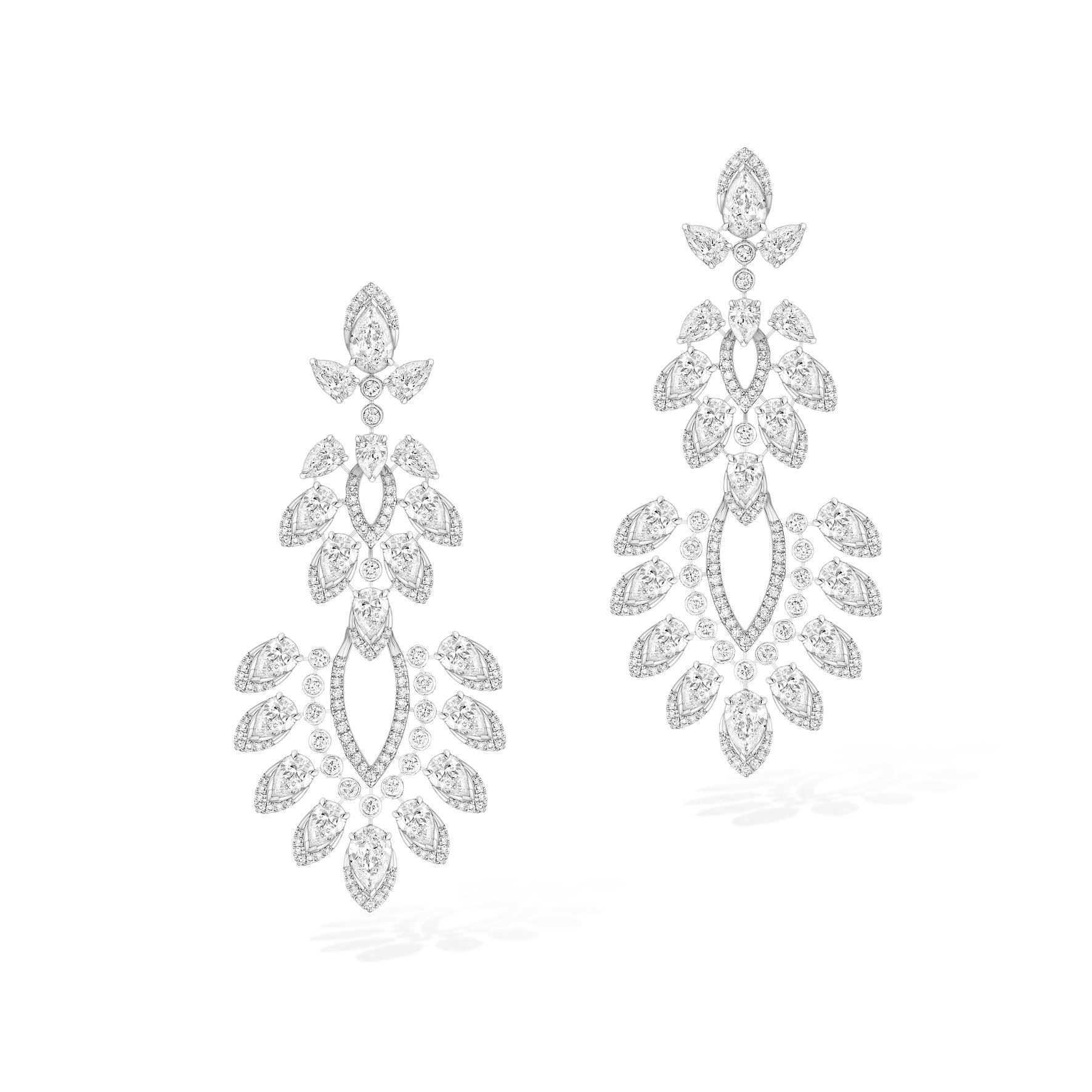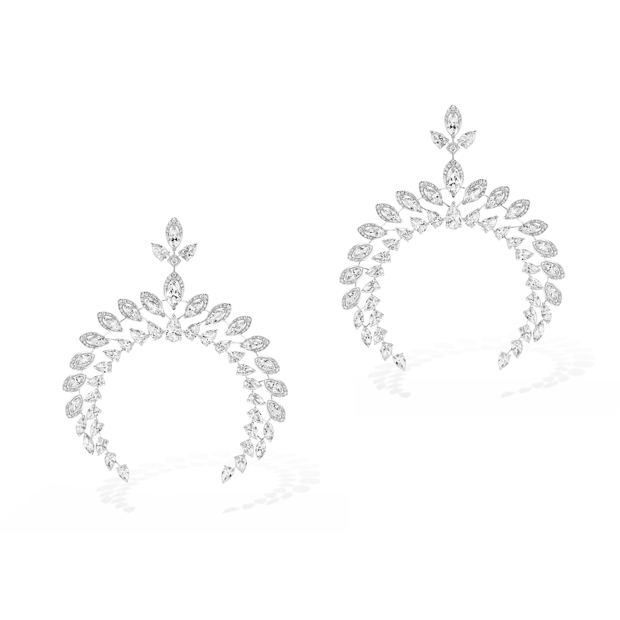 Anillos y aretes desarrollados en oro blanco y diamantes son utilizados para dar sostén a este juego de joyería que replica una especie de candelabro resplandeciente.