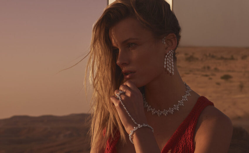 Inspirada en el misterioso animal que se posa en los desiertos de los Estados Unidos, este tipo de engaste y construcción replica a la serpiente, que se posesiona del cuello, pulso y dedos de nuestra modelo y hace de las suyas también vistiendo sus orejas con un magnífico juego de aretes.