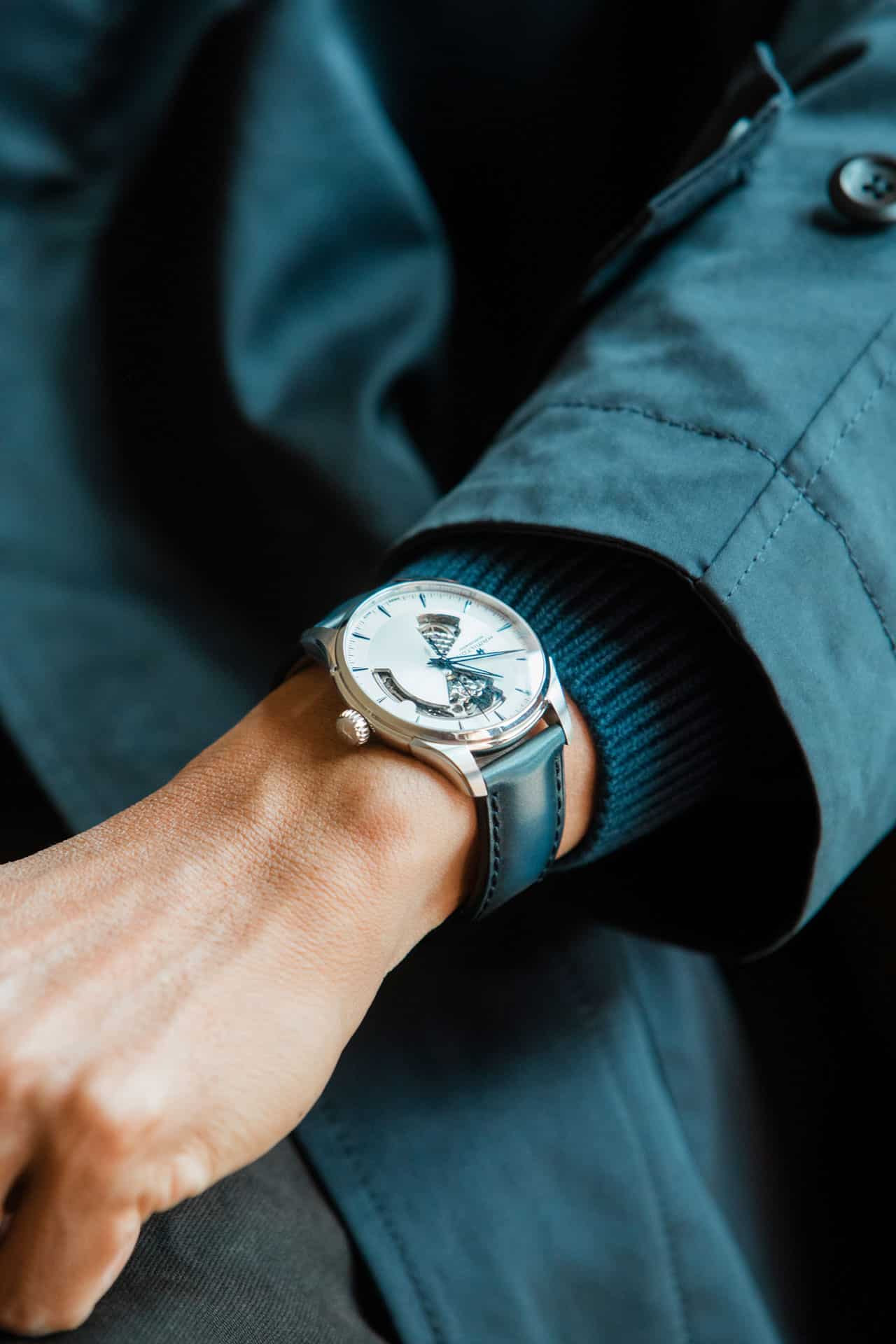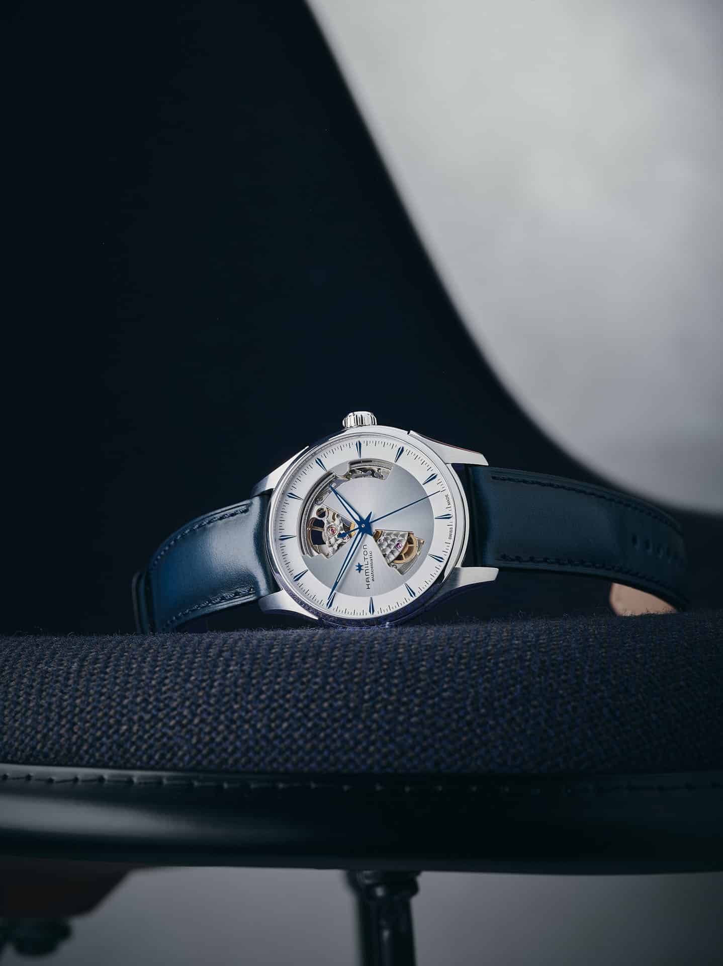 La carátula blanca-plateada con agujas azuladas y la correa de piel azul oscuro, ya disponible en 42 mm, ponen el broche final a los nuevos modelos Jazzmaster Open Heart Automatic de 40 mm.