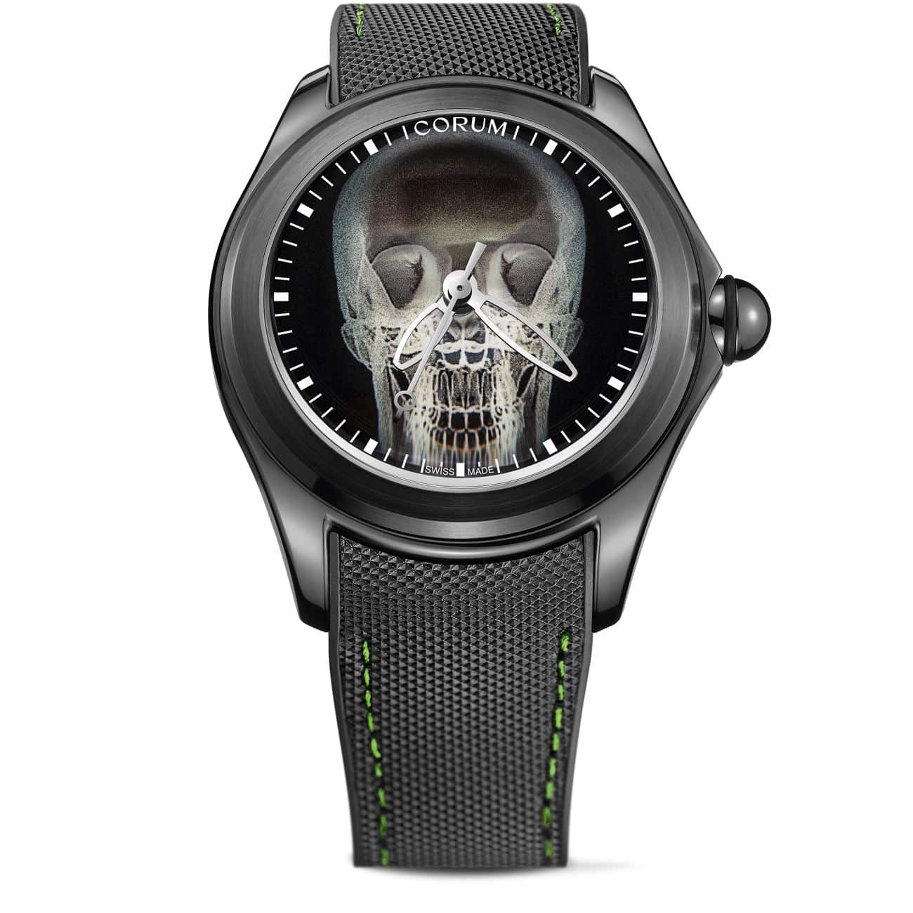 El famoso Bubble de Corum está de vuelta con una carátula de calavera luminosa que refleja los primeros diseños del modelo. El Corum Bubble X Ray cuenta con una caja de acero inoxidable con revestimiento de PVD negro de 47 mm, que alberga un movimiento automático a 4 Hz, que es visible a través de un fondo de caja de cristal de zafiro. Pero es el cristal de zafiro exagerado y muy abovedado en el lado del dial lo que le da su nombre al reloj, distorsionando la vista de manera espectacular.
