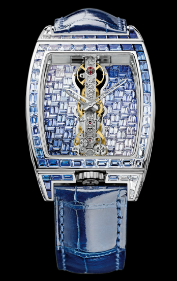 Compuesto por zafiros azules y diamantes, las piedras resplandecen en caja, carátula, bisel, asas y carrura, composición que ofrece un espectáculo cautivante, pone en escena nada menos que 546 zafiros baguette azules (~20,63 quilates y 478 diamantes baguette (~14,01 quilates), o respectivamente 360 zafiros (~15,18 quilates) y 10 diamantes (~0,29 quilates) para la versión con brazalete de piel de cocodrilo azul dotado de una hebilla con 26 diamantes redondos (0,31 quilates).