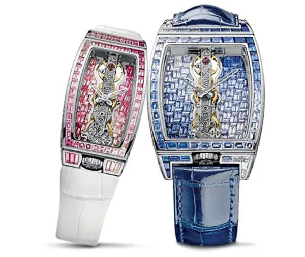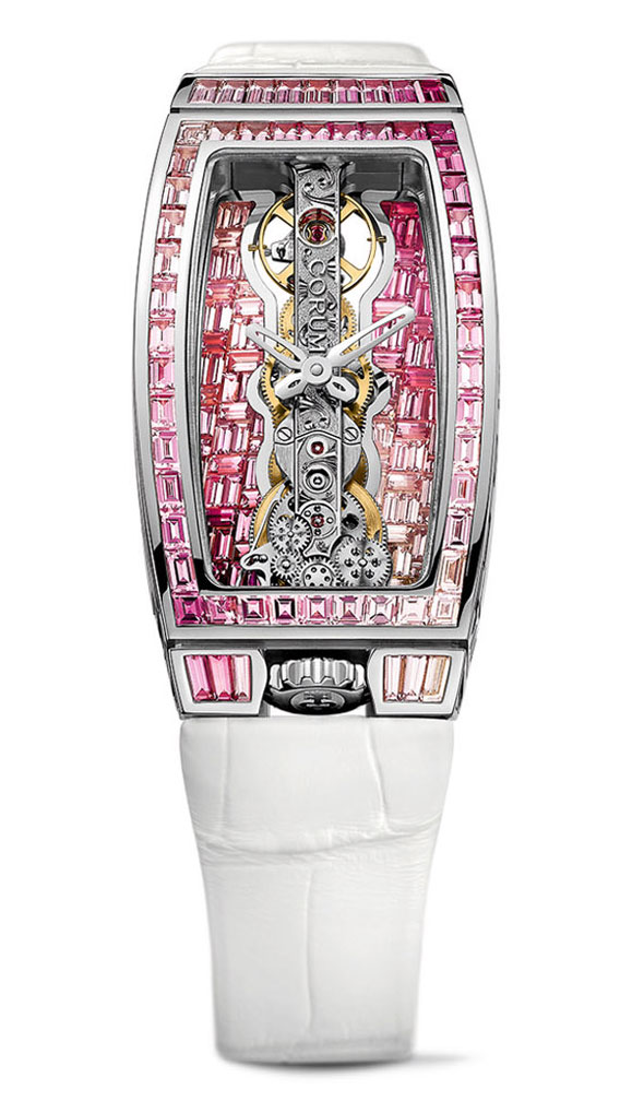 El color natural de la mujer, o al menos el que más se asocia a ella es el rosa, y es así que los zafiros han sido minuciosamente seleccionados a la par de los diamantes. La carátula posee (86 zafiros para ~1,56 quilates), que brillan sobre el bisel (53 zafiros para 3,1 quilates), resplandecen sobre la carrura (84 zafiros para ~3,1 quilates), antes de fluir en una cascada hipnótica sobre el brazalete que pone en escena 233 zafiros baguette de color rosa (~6,83 quilates) y 176 diamantes baguette (5,16 quilates). Puntuando esta obra llevada por penetrantes tonos rosa, 10 diamantes blancos de talla baguette (~0,32 quilates) salpican delicadamente la esfera y la caja. Esta hermosa obra maestra también está disponible con un brazalete de piel de cocodrilo blanco dotado de una hebilla desplegable de oro de 18 quilates engastada con 20 diamantes (0,23 quilates).