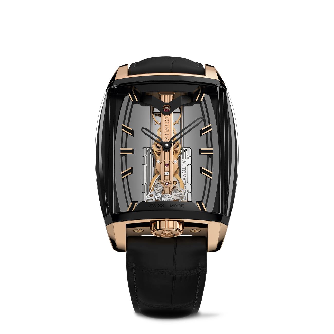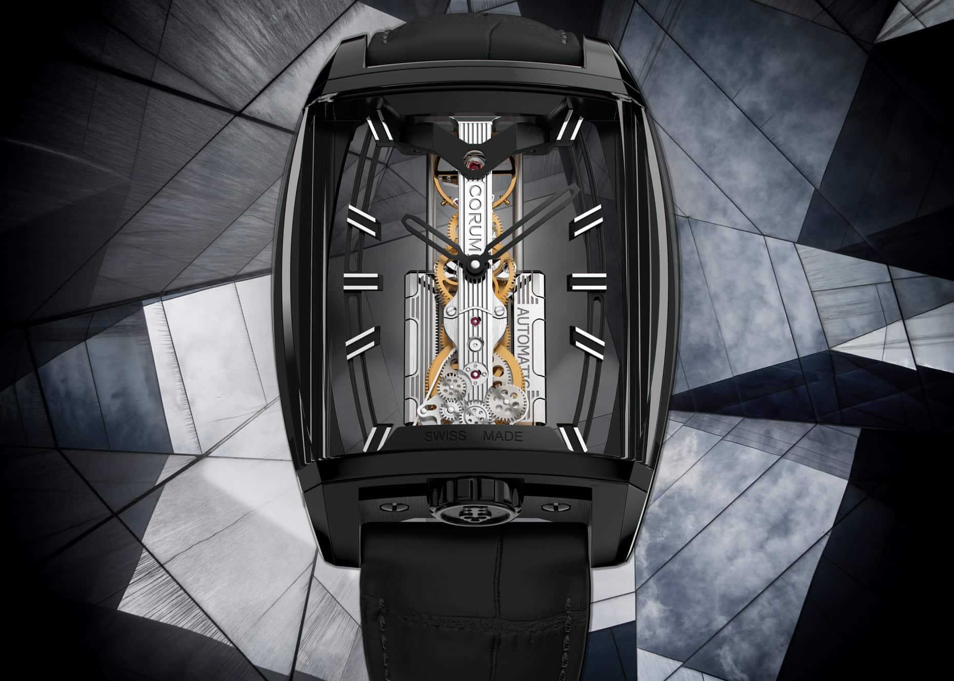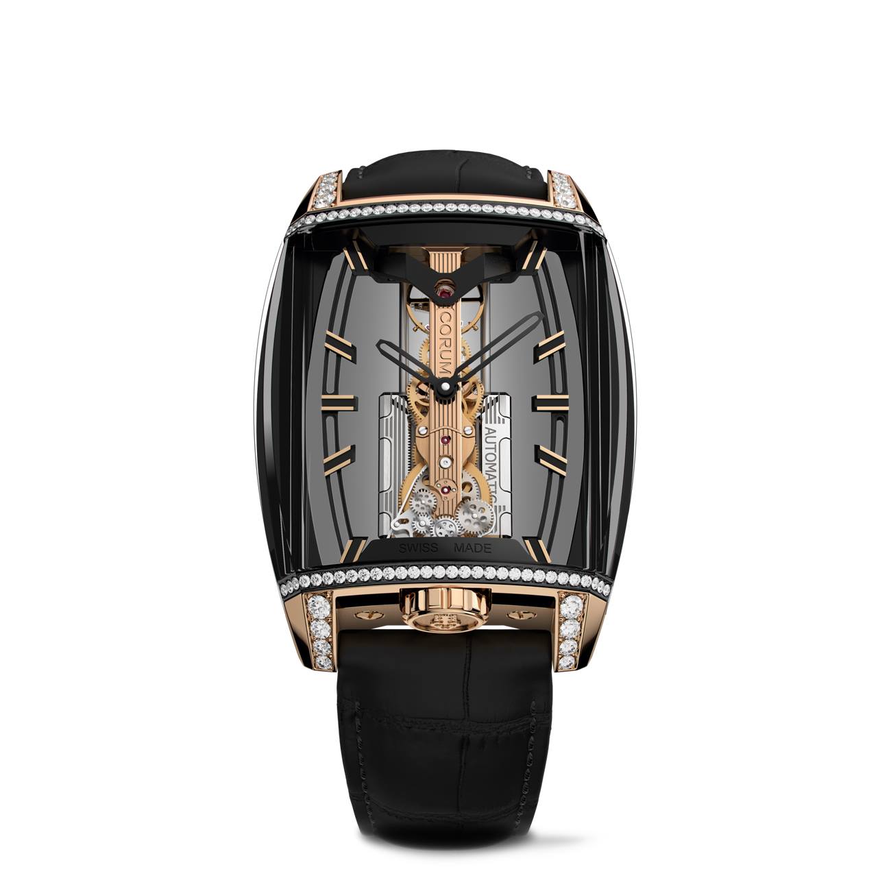 Se presentan cuatro modelos, la caja en forma de tonel ofrece una vista espectacular del movimiento gracias al cristal de zafiro panorámico y al fondo de la caja en un tamaño más grande. Además, por primera vez, Corum crea el cristal de zafiro como una sola pieza de zafiro que se extiende desde el cristal superior hasta los lados del reloj, lo que permite una vista interior de 360 grados.