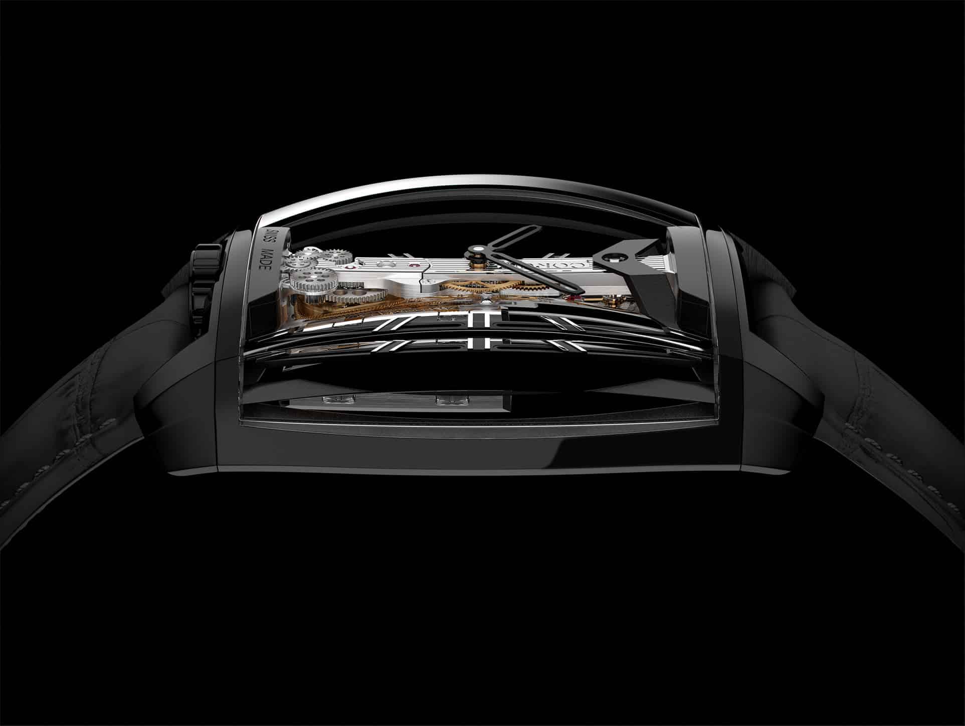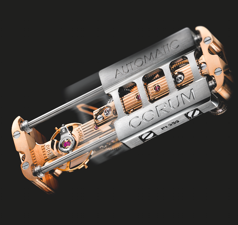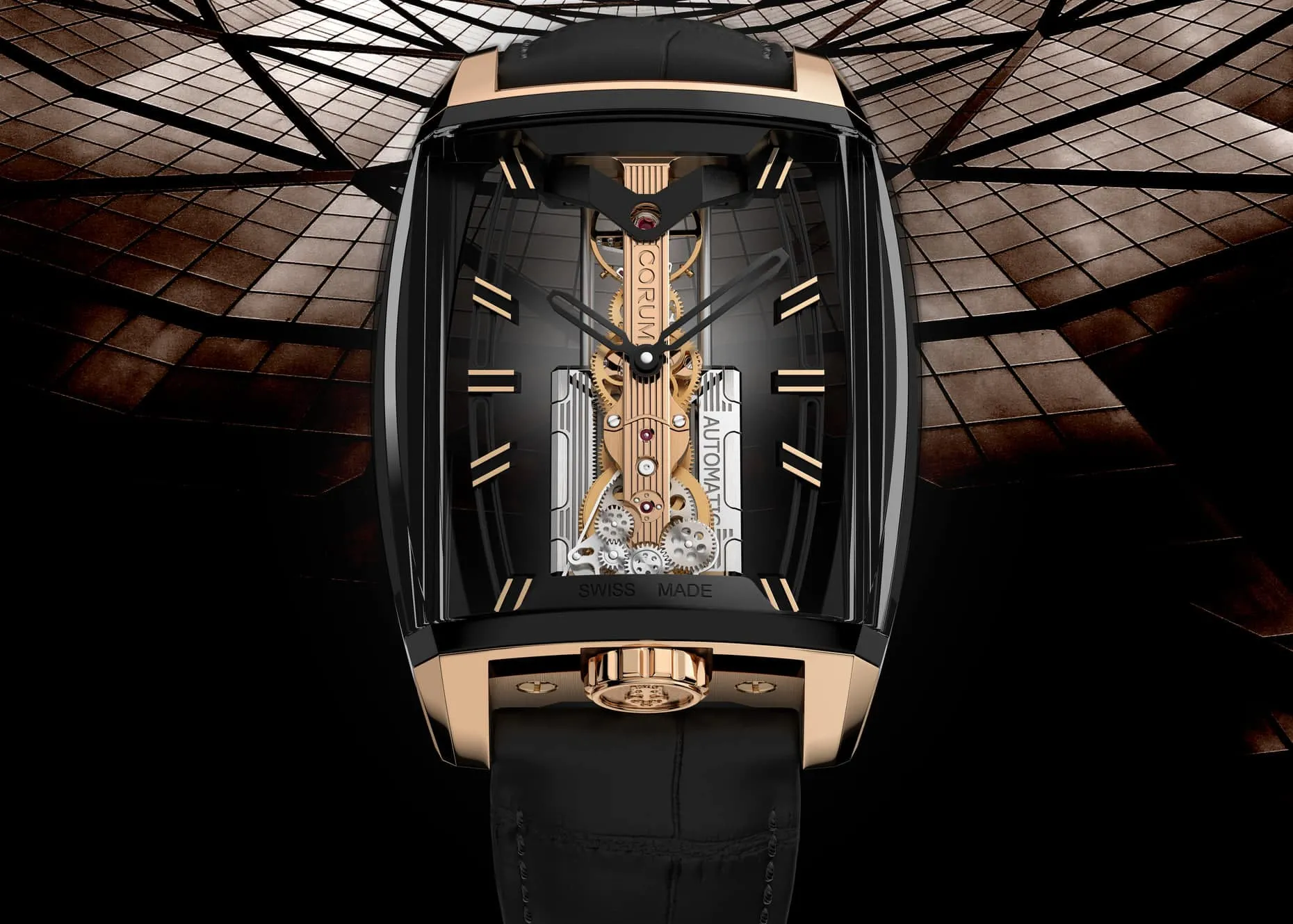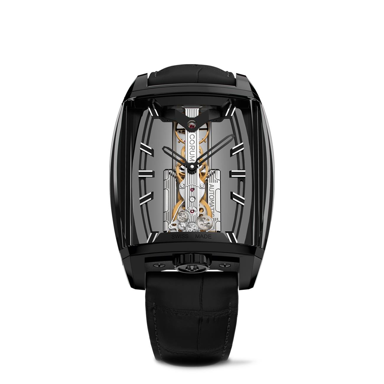 Se presentan cuatro modelos, la caja en forma de tonel ofrece una vista espectacular del movimiento gracias al cristal de zafiro panorámico y al fondo de la caja en un tamaño más grande. Además, por primera vez, Corum crea el cristal de zafiro como una sola pieza de zafiro que se extiende desde el cristal superior hasta los lados del reloj, lo que permite una vista interior de 360 grados.