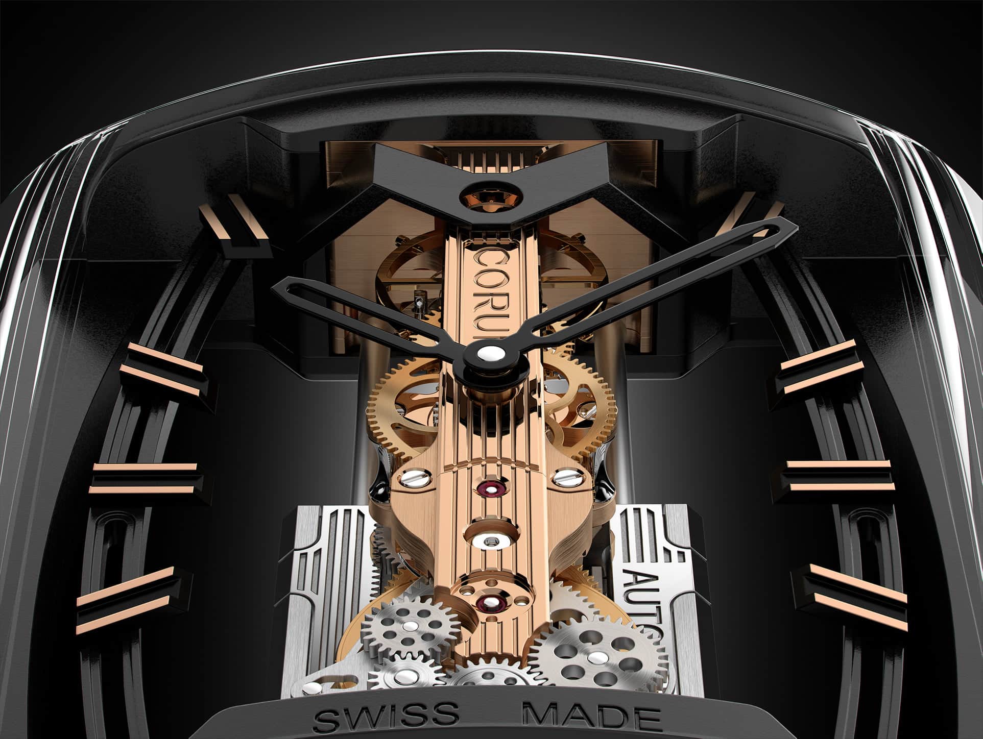 Corum ha inventado un sistema de arnés flotante colocado discretamente para sus índices aplicados, lo que produce un estilo muy moderno y sofisticado. En realidad, el diseño nace de la necesidad de funcionalidad. Debido a que no hay una carátula al que fijar los índices, el sistema de arnés se enlaza con la base del movimiento de modo que los marcadores parecen flotar en el espacio. Las platinas principales y los puentes del movimiento son de oro de 18 quilates para todas las versiones.