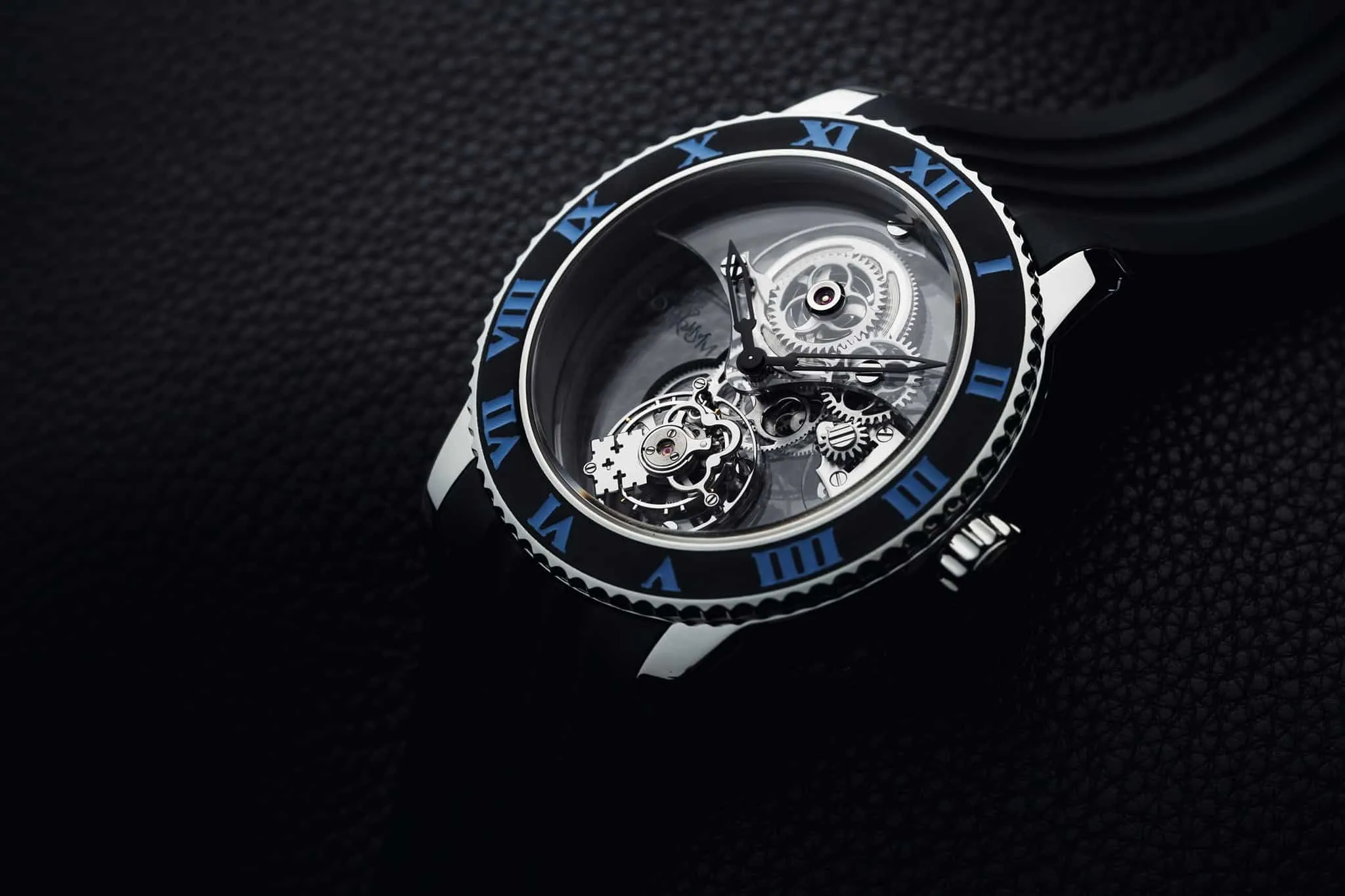 Al paso de los años y fiel a su legado, Corum amplía las características técnicas con el nuevo Romvlvs 44 Tourbillon, presentado este año en una caja de titanio grado 5 con 44 mm de diámetro con bisel de caucho y números azules romanos. Al interior porta un movimiento de manufactura esqueletado calibre CO 374, con tourbillon volante y 90 horas de autonomía.