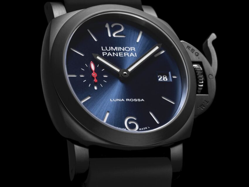 La versión en blanco cuenta con un diámetro más compacto en 38 mm. Mientras tanto, la versión Quaranta, como su nombre lo indica, porta una caja en 40 mm. Ambos relojes utilizan el icónico calibre automático P.900 que cuenta con una conveniente reserva de marcha de hasta 3 días. La versión azul porta una correa bi-material que combina textil con caucho en azul Luna Rossa. Mientras tanto, la versión blanca presenta una correa blanca Saffiano Luna Rossa en piel de becerro con una línea roja en el centro además de la opción bi-material anterior en color gris.