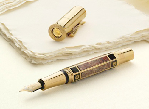Pluma del Año 2014, así califica la propia casa de escritura al instrumento perteneciente a su colección de lujo, que está inspirado en la arquitectura tipo romana del Palacio de Catalina de San Petersburgo, antigua capital del Imperio Ruso. La nueva edición de la “Pluma del Año 2014” presenta un útil limitado a 300 estilográficas y 30 bolígrafos convencionales. Su cuerpo resplandece de manera majestuosa gracias al chapado en oro de 24 quilates que contrasta con las pequeñas placas color negro distribuidas a lo largo del mismo, al tiempo que una roseta de oro con incrustaciones de media decena de piedras de jaspe, recupera el diseño de uno de los palacios más bellos de todo el planeta..