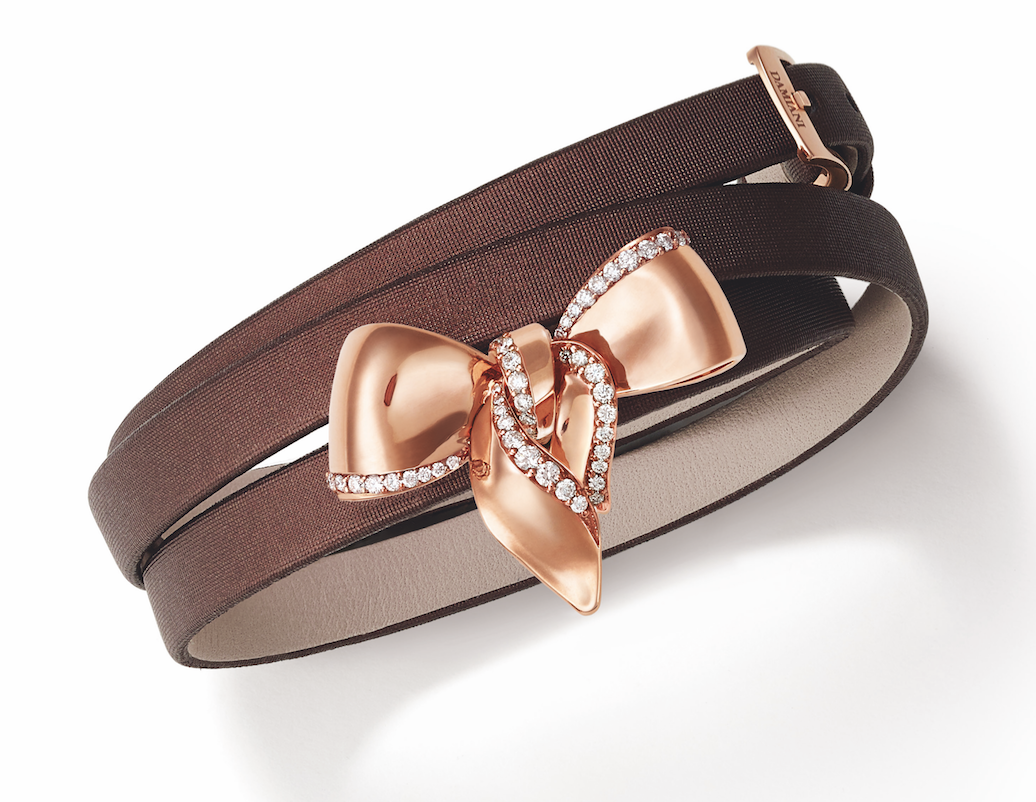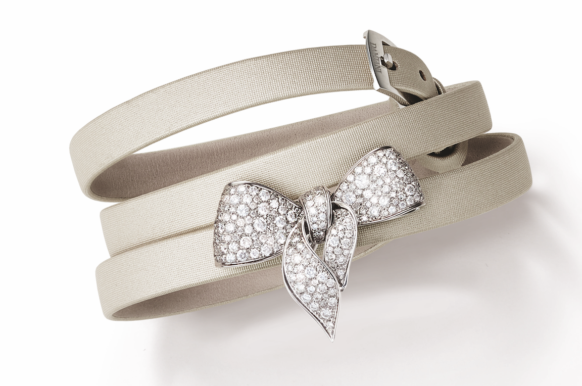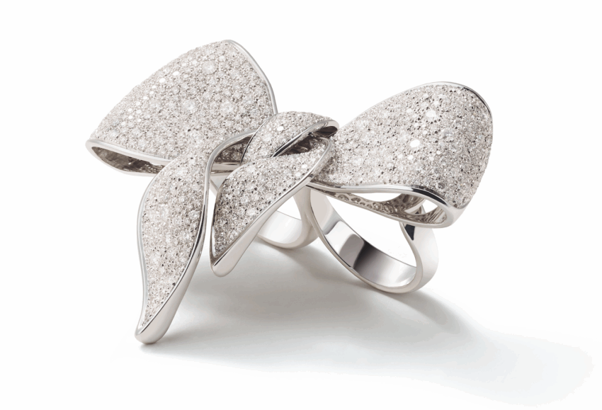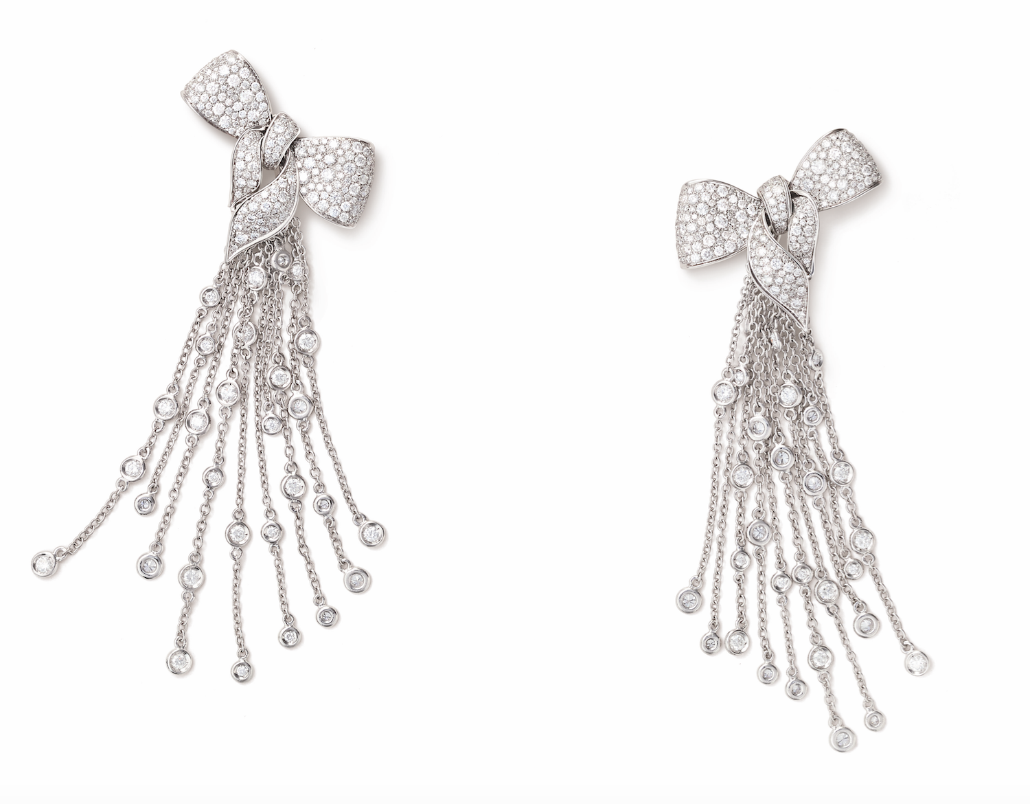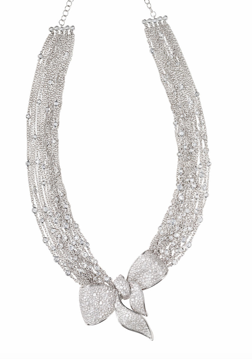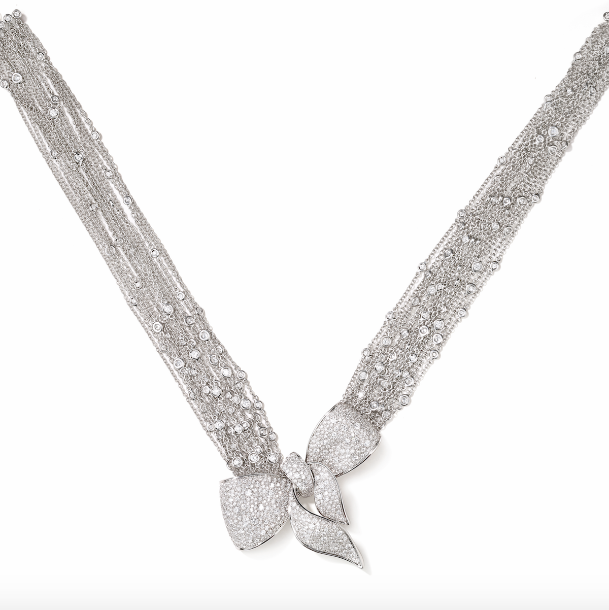Las aplicaciones en pavé de diamantes blancos enfatizan una naturaleza atemporal sobre oro blanco. La combinación del moño en este engastado es única, ya que otorga una composición extraordinaria que se combina con el espíritu italiano para acompañar a mujeres románticas y soñadoras. El abuelo de Nicoletta, Nicola Romanov, es tataranieto del último Zar de Rusia, mientras que su abuela, Sveva, desciende de una de las familias más renombradas de Italia, misma que incluso inspiró algunos de los cantos de Dante en La Divina Comedia.