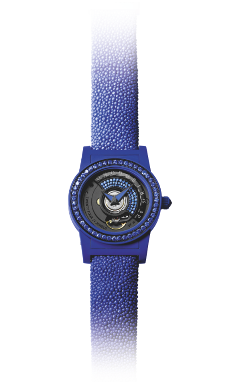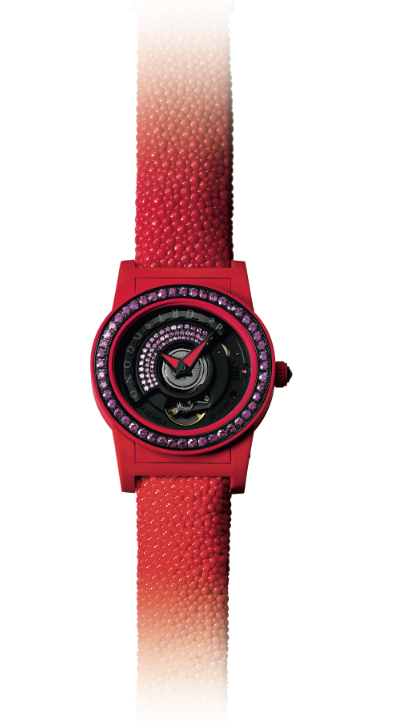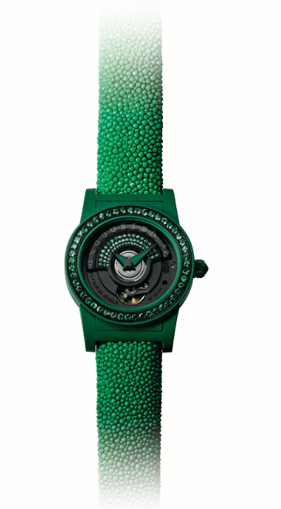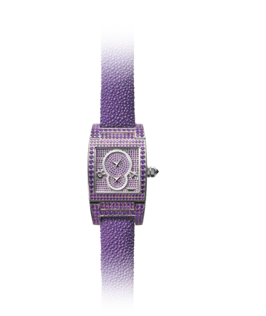 Lo mismo ocurre con los colores de los nuevos Instrumentino, que estilizan la vida pastelizando sus luces. Si el doble arabesco de las horas sobre la carátula crea un cierre abierto sobre el tiempo, la capa de las piedras evoca, en su palidez nacarada o en sus profundidades sombrías, los mosaicos bizantinos y las cámaras de maravillas de los antiguos mineralogistas. La zarina rusa tenía su famosa Cámara de ámbar en el palacio de Tsárskoye Seló: a continuación llegaron las cámaras de amatista, de zafiro rosa y hasta de zafiro naranja. Las piedras crean una suavidad de terciopelo que realza, mediante la destreza del engaste y la textura de las pulseras a juego, los volúmenes de un reloj abierto al mundo con sus dos indicaciones de la hora.