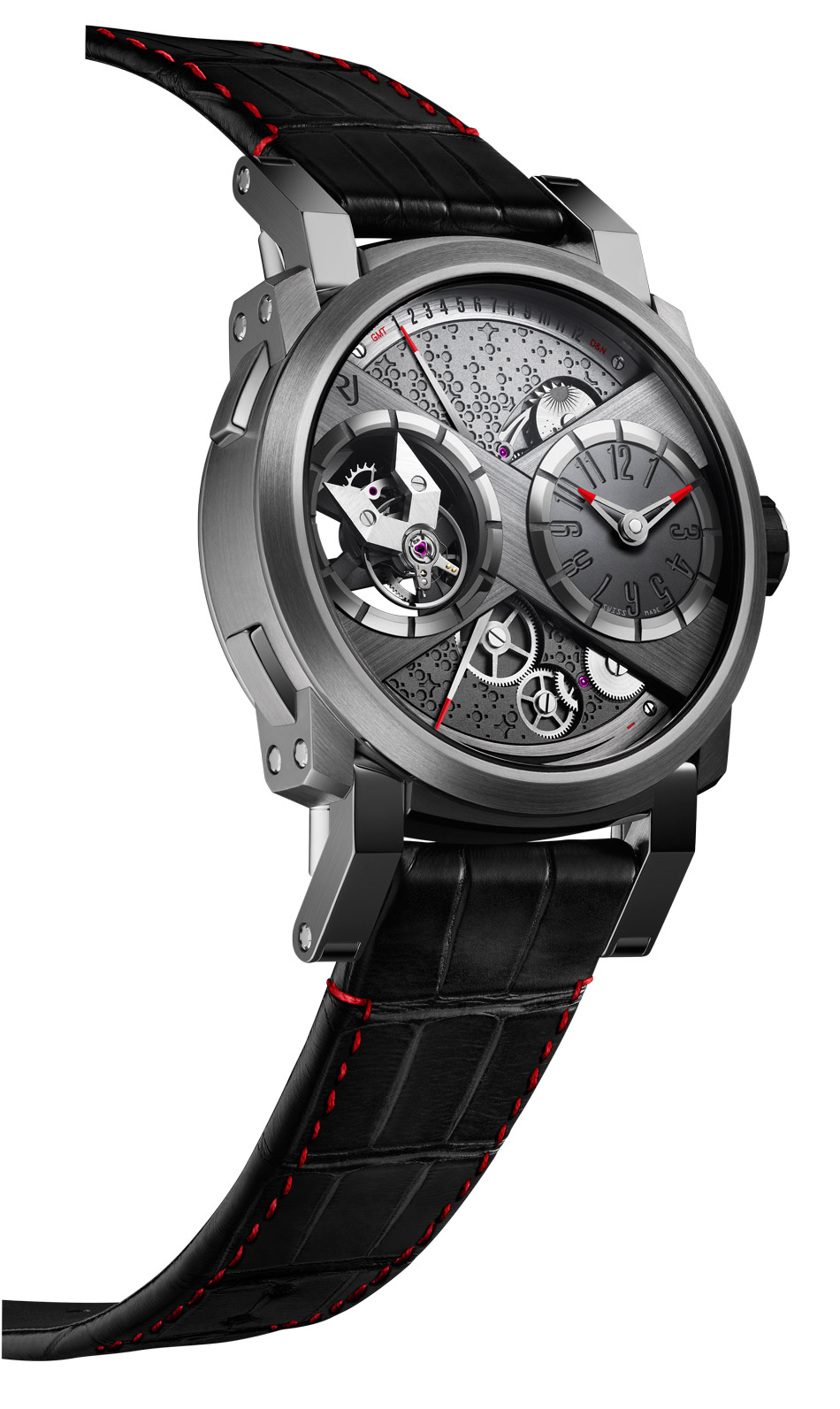 El resultado son 25 piezas de Edición Limitada que presentan al tourbillon en punto de las 9 h, horas y minutos a las 3 h, indicador de la reserva de marcha a las 6 h y, una complicación GMT con mecanismo retrógrado saltante a las 12 horas. Asimismo, una rueda –completamente funcional– aparece grabada para indicar si es de día o noche.
