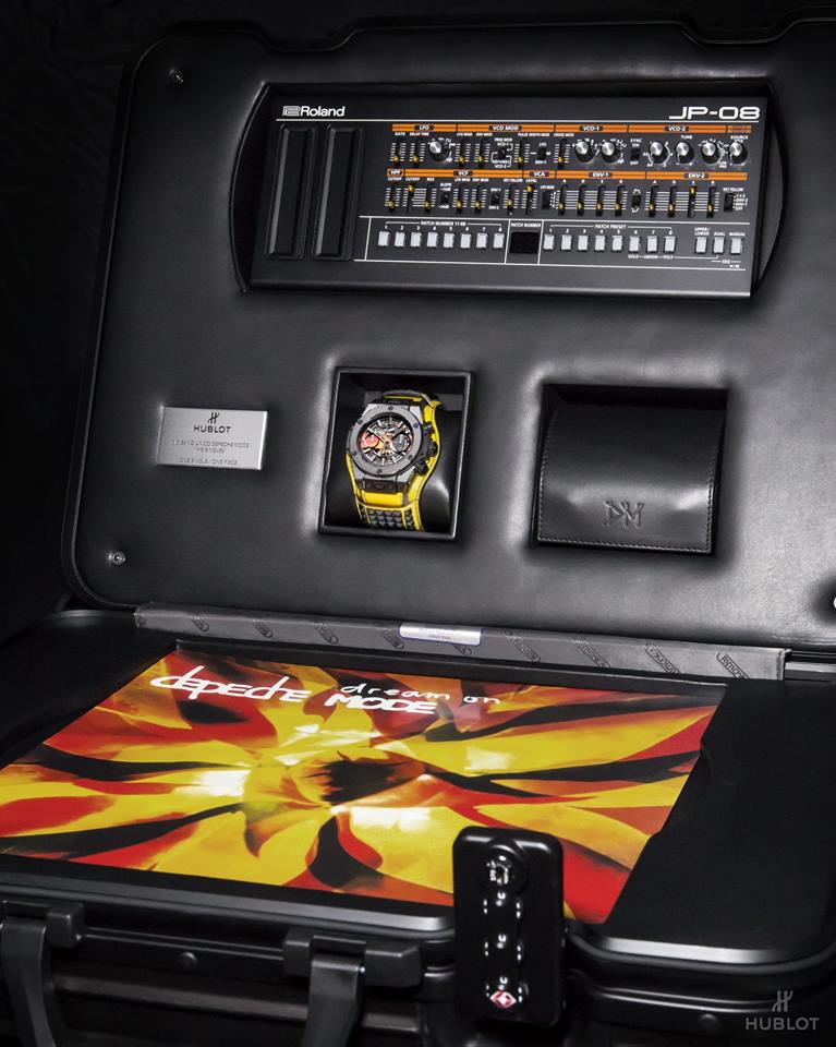 Postdata, la colección The Singles de Big Bang Depeche Mode se entregará junto con un sintetizador Roland JP-08. Este aparejo es un módulo sintetizador de Edición Limitada, y que rinde homenaje al original Roland Jupiter 8, utilizado por Depeche a lo largo de los años. Asimismo, Rimowa ha creado una maleta Topas Stealth de aluminio negro anodizado para exhibir esta colección. El elegante estuche está hecho a medida y protegerá el reloj como pieza única junto con un certificado de autenticidad firmado por la banda.