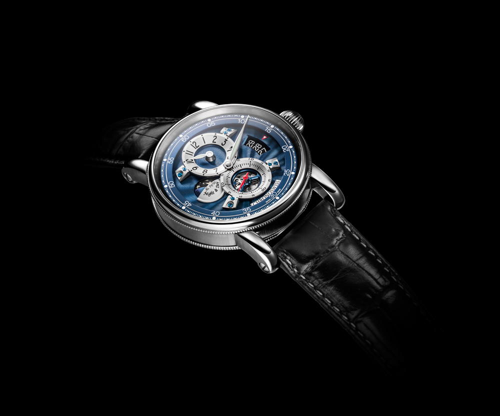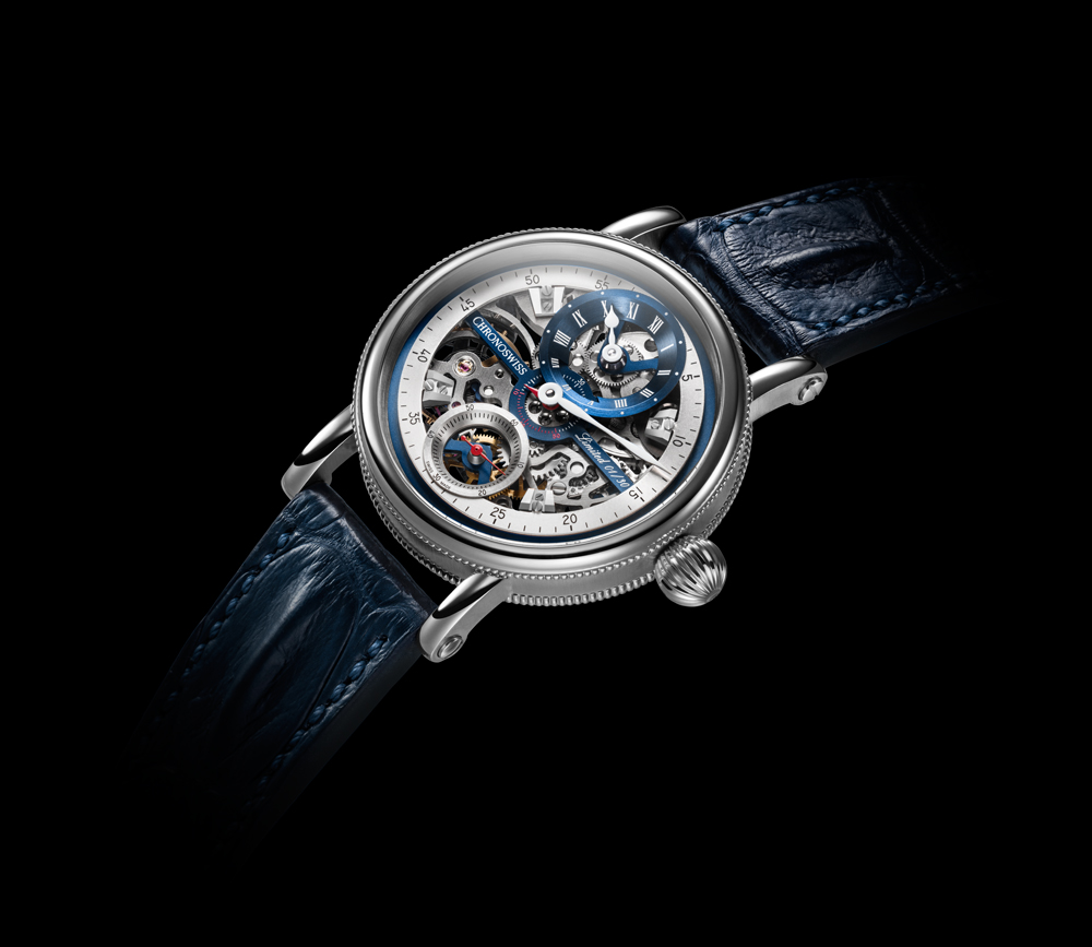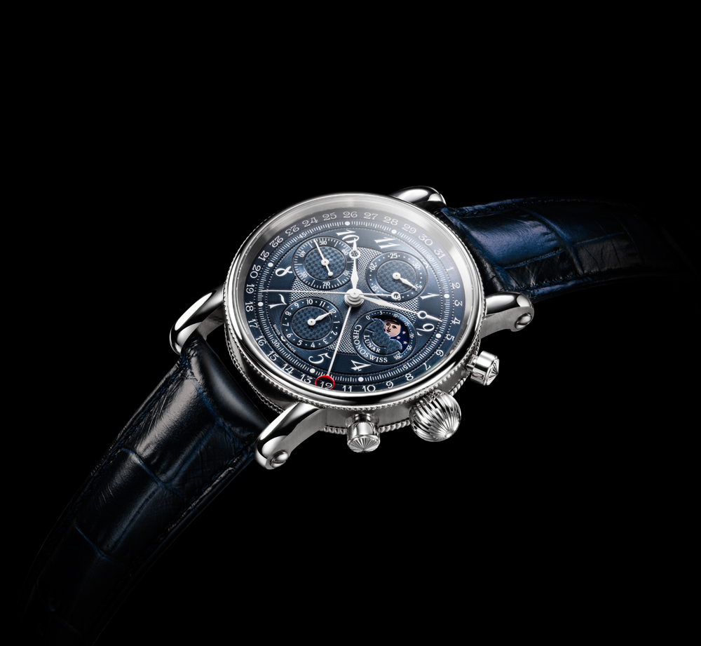 Desarrollado en caja de 41 mm de acero inoxidable con acabado estriado, la pieza ofrece una carátula guilloché galvanizada en color azul, de la cual se cuentan las indicaciones de horas, minutos, pequeño segundero, fechador, fases de Luna, cronógrafo central, totalizador de 30 minutos y uno más de 12 horas. La referencia está animada por el calibre C.755 de la marca, con 46 horas de autonomía a 4 Hz. Se abraza al pulso mediante una correa de piel de cocodrilo de Louisiana.