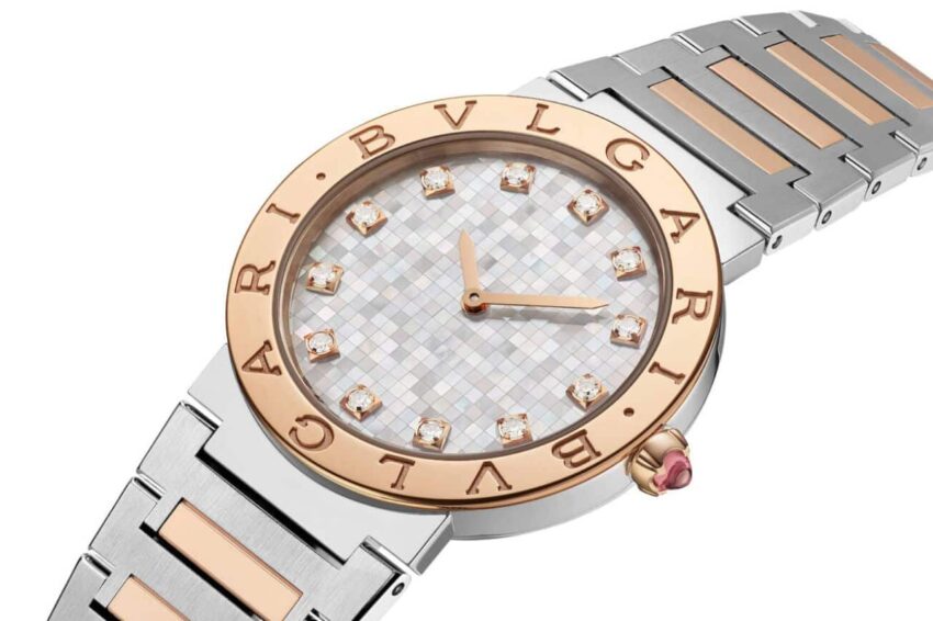 Bvlgari Bvlgari Edición Limitada está disponible con una caja de acero y oro rosa de 23 mm (400 piezas) y de 33 mm (1,100 piezas). En ambas versiones, el bisel de oro rosa tiene el grabado Bvlgari Bvlgari. Este detalle, que proviene de las antiguas monedas romanas, se convirtió en el principal distintivo del reloj desde su lanzamiento en los años 70. En los dos tamaños, la corona de acero y oro rosa está engastada con una rubelita talla cabochon.