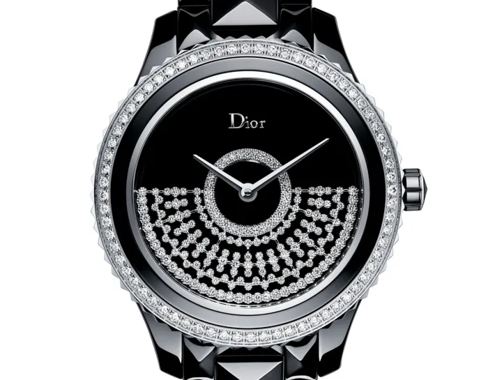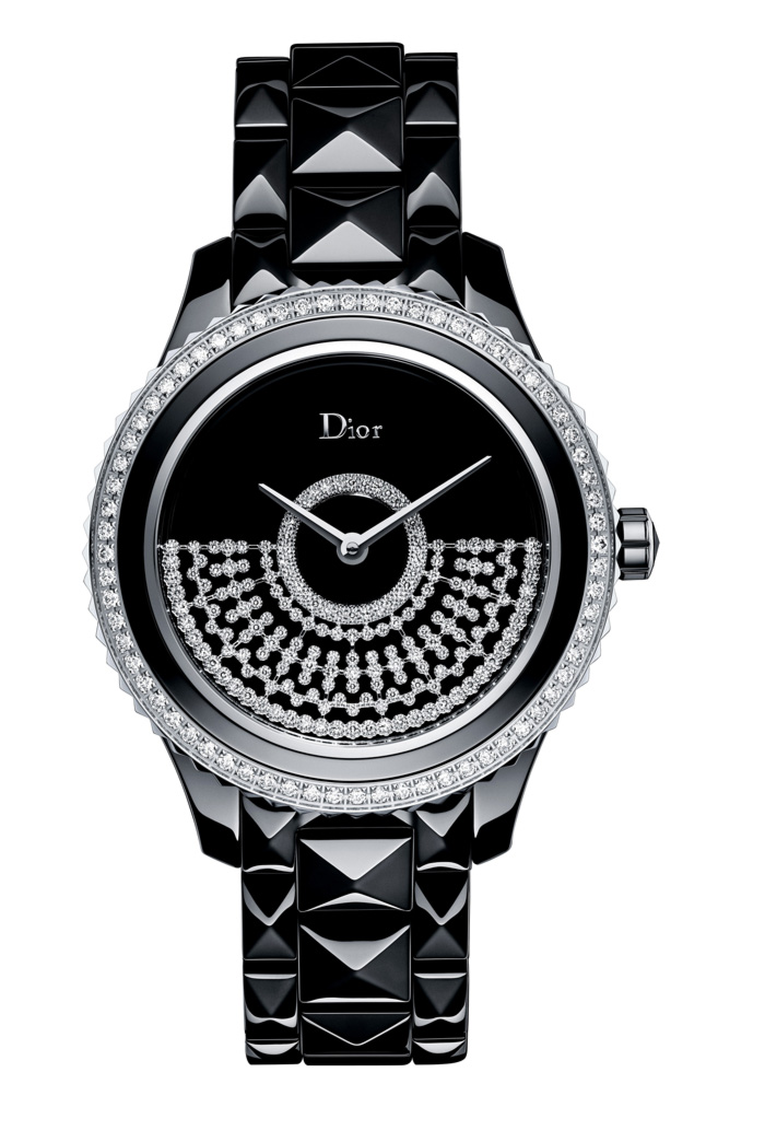 DIOR VIII GRAND BAL Résille Model // Movimiento: mecánico automático / Calibre: Dior Inversé / Masa oscilante patentada con diamantes engastados y en posición frontal / Reserva de marcha: 42 h / Funciones: horas y minutos / Caja: 38 mm de cerámica negra con oro blanco / Bisel: engastado con diamantes y anillo central de cerámica / Cristal: zafiro / Carátula: madreperla de Vietnam / Brazalete: cerámica negra de alta tecnología en forma piramidal / Hermeticidad: 50 metros.