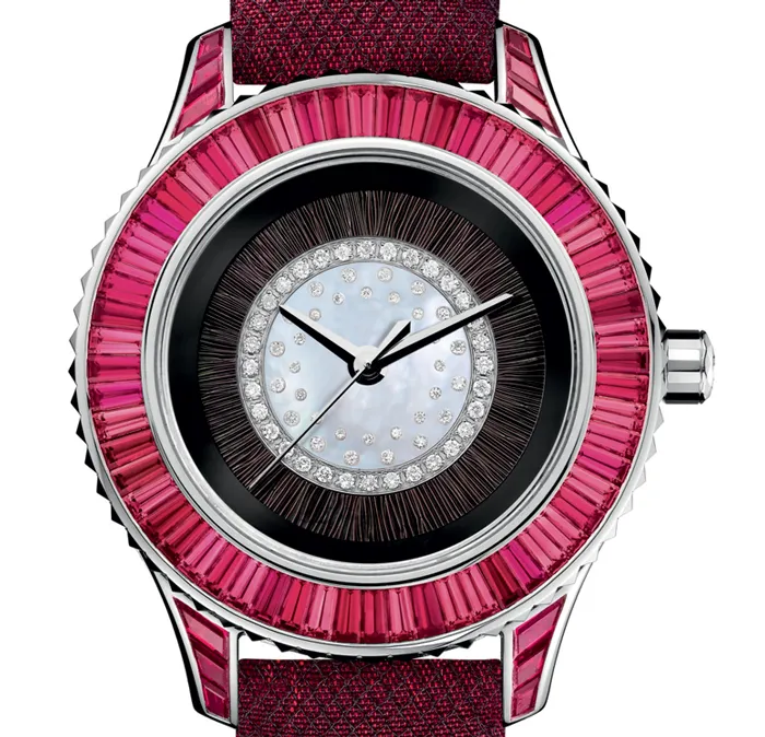 Una oda a la ultra-feminidad y color, el novedoso modelo revela sus secretos con sutileza y refinamiento. Equipado con un movimiento automático Elite de la manufactura Zenith, alojado en una caja de oro enaltecida por una carátula finamente trazada y un bisel excepcionalmente engastado con rubíes y espinales en corte baguette, cada reloj revela un fondo precioso y complejo: sus incrustaciones de madre perla se funden en armonía, descriendo en su carátula un tributo a la visión con etiqueta “Christian Dior París”.