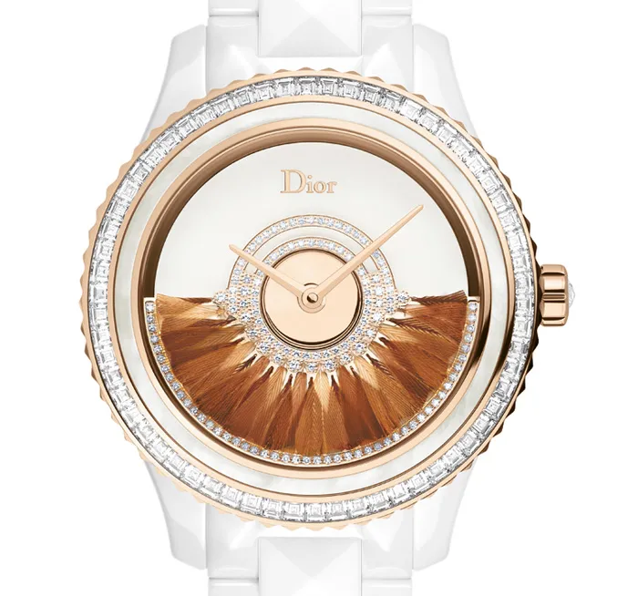 Dior Gran Bal “Plume” // Caja: 38 mm de cerámica blanca / Movimiento: mecánico automático / Calibre: “Dior Inversé 11 ½” / Bisel: oro rosa engastado con diamantes talla baguette / Cristal: zafiro por ambos lados / Funciones: horas, minutos y segundos / Brazalete: cerámica blanca de alta tecnología / Carátula: decorado con plumas color beige y set de diamantes (patentado) / Hermeticidad: 50 metros.