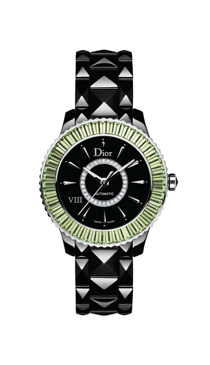 Caja de 33mm –movimiento automático– oro blanco, cerámica negra, diamantes y peridotos, laca negra, diamantes aplicados a mano en los marcadores de la hora, anillo central con diamantes, reborde negro con marcadores luminiscentes así como las agujas de horas y minutos. Funciones: horas, minutos y segundos, hermeticidad de 50 metros