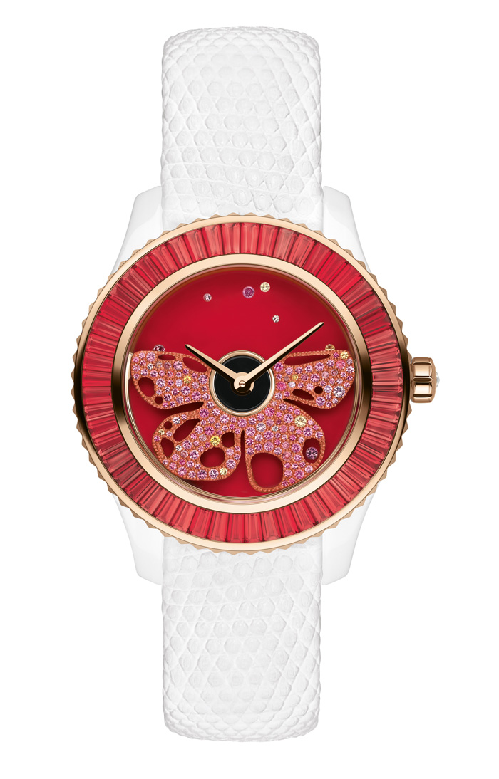 Su movimiento invertido, presenta un calado hermoso y funcional salpicado de diamantes, mientras que el rotor baila y carga al compás del vaivén de la muñeca femenina adornada por minerales preciosos. Surgido y sugerido a partir de la predilección de Monsieur Dior por los grandes bailes, esta danza es bella, es arte, es única…