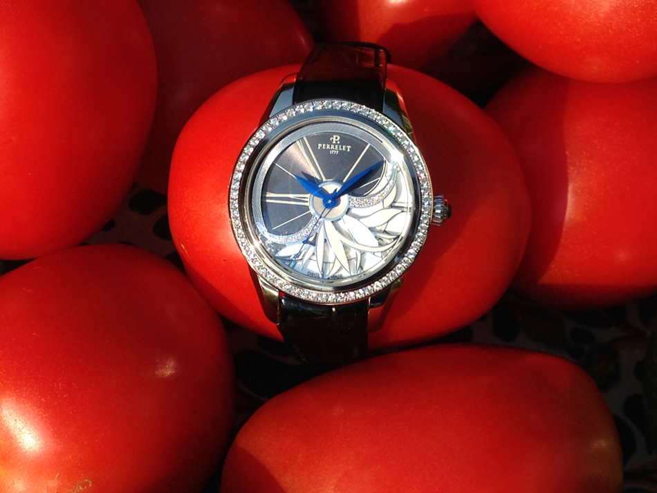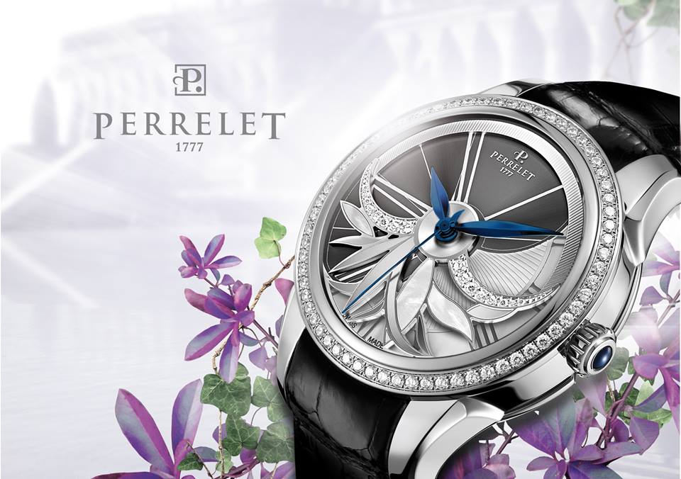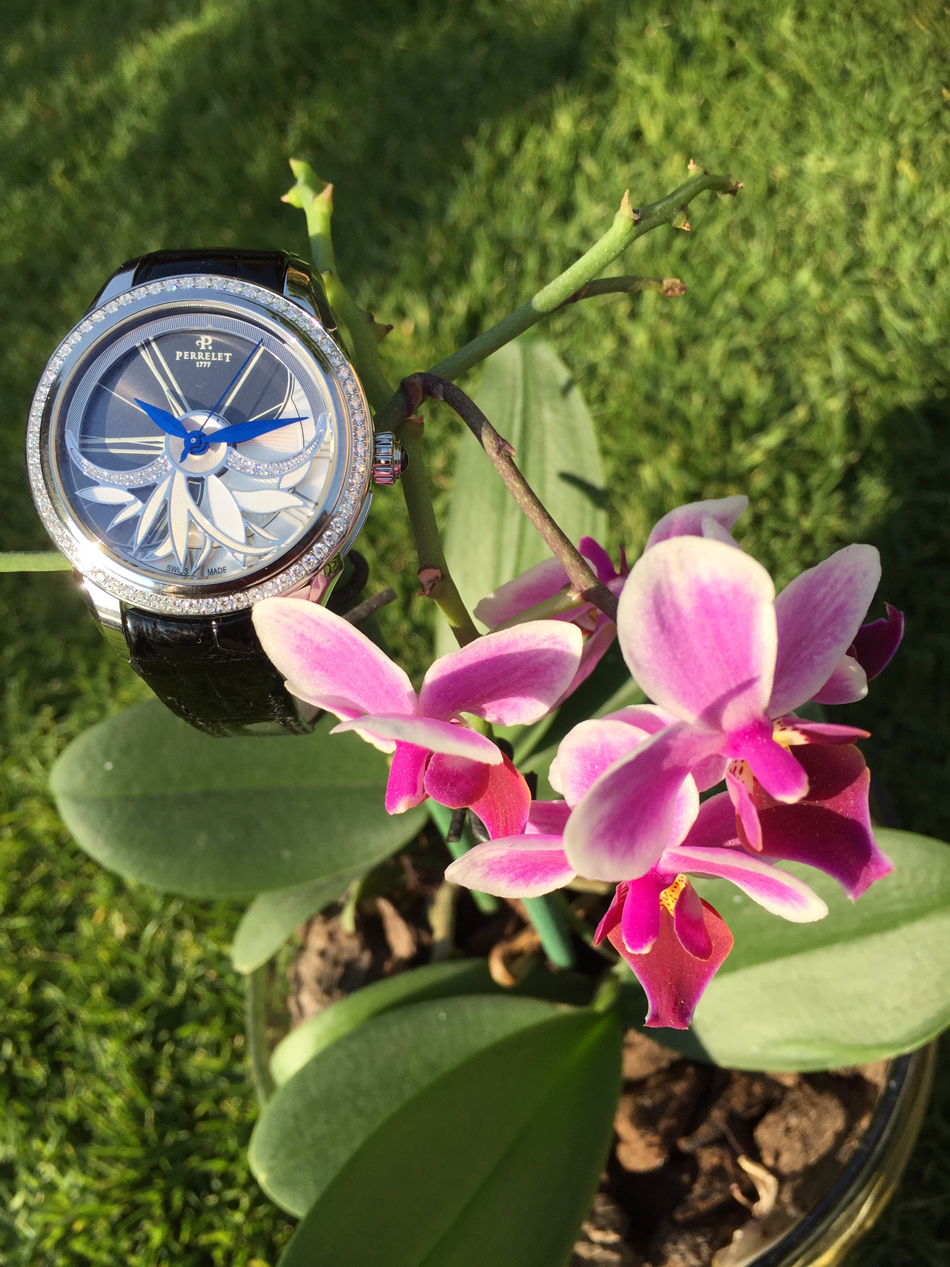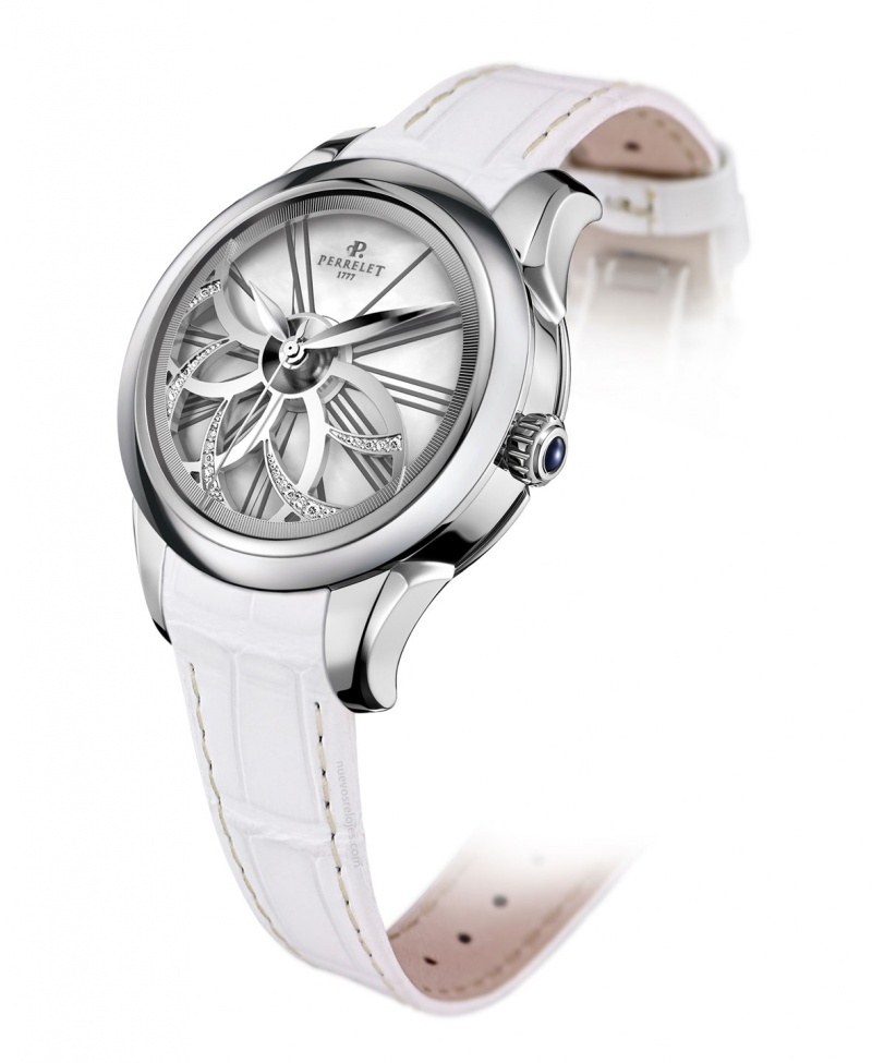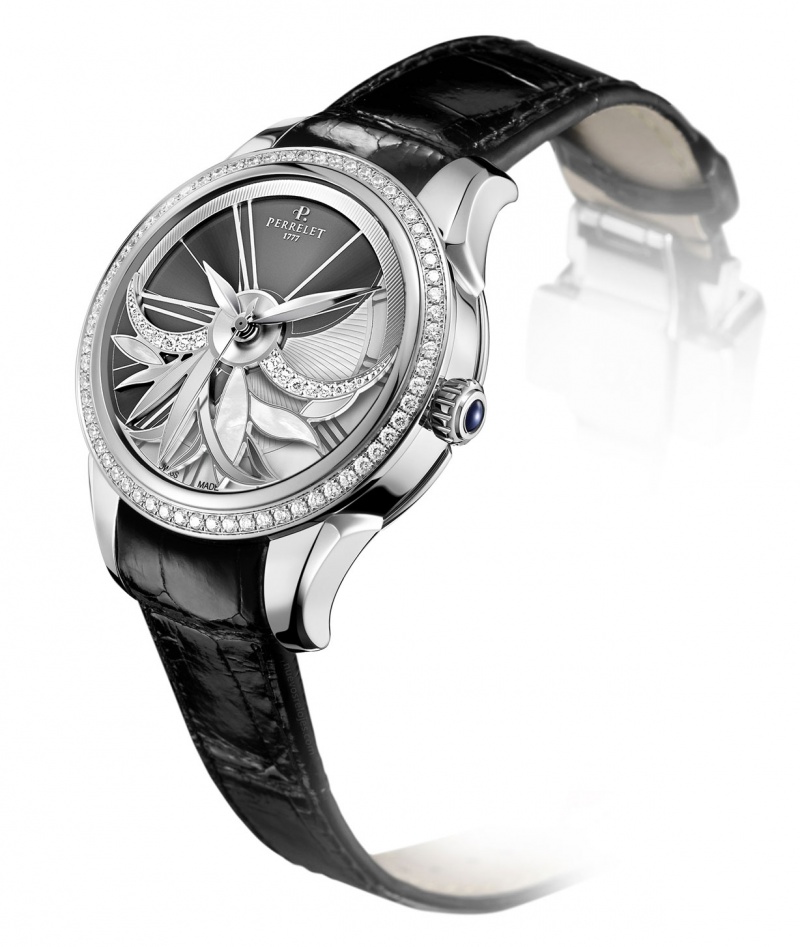 Las curvas y pétalos de la flor, han sido propuestos en la atrevida y original carátula de Perrelet, que se inspira en el movimiento de la turbina para entregar un objeto magnífico de doble rotor, situando al frente un espectáculo floral de brillos y rotación gracias a los contrapesos, diamantes y madreperla añadidos en el dial.