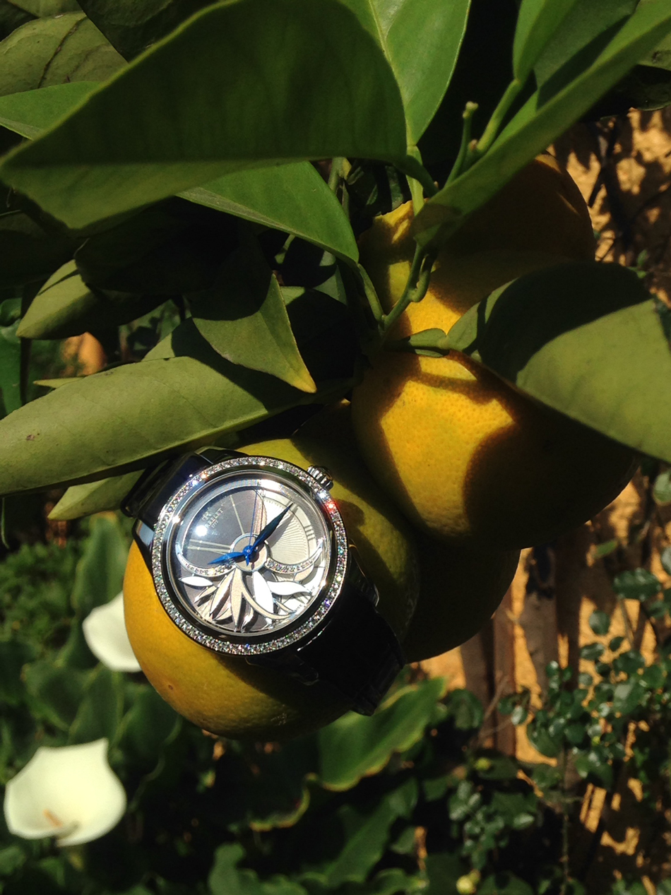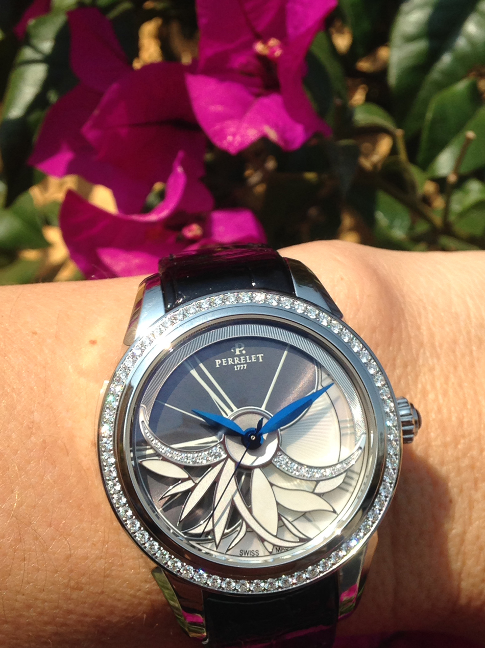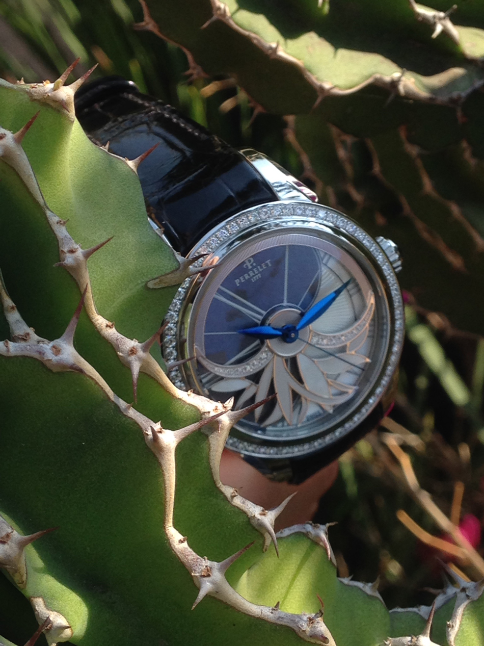 Las curvas y pétalos de la flor, han sido propuestos en la atrevida y original carátula de Perrelet, que se inspira en el movimiento de la turbina para entregar un objeto magnífico de doble rotor, situando al frente un espectáculo floral de brillos y rotación gracias a los contrapesos, diamantes y madreperla añadidos en el dial.