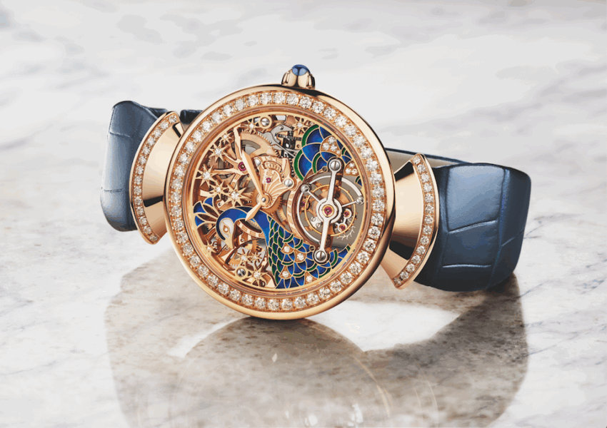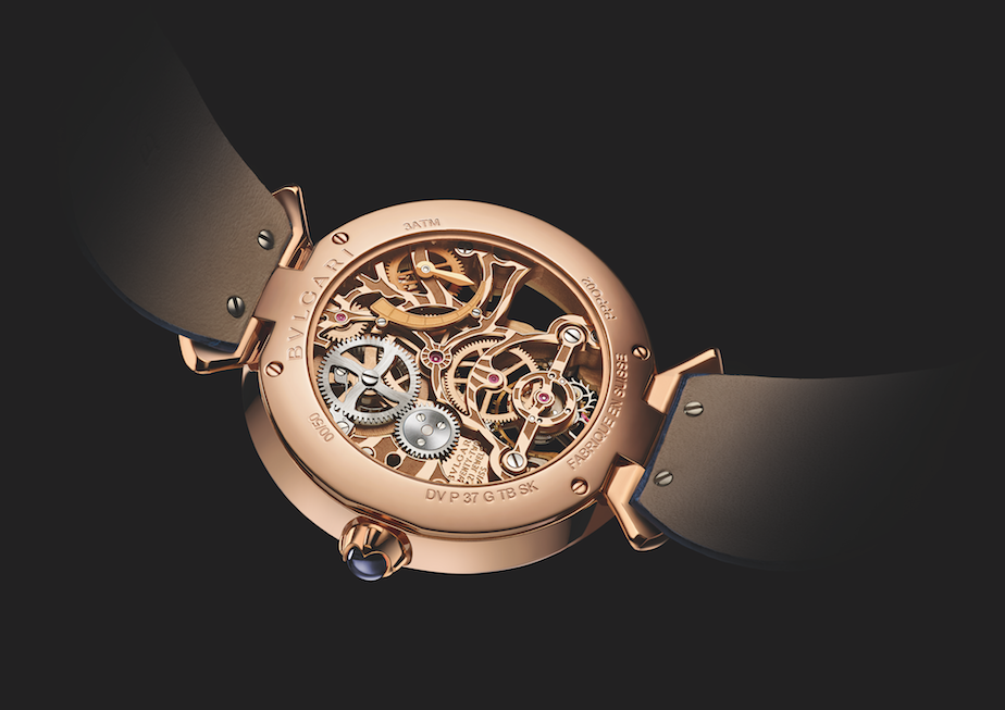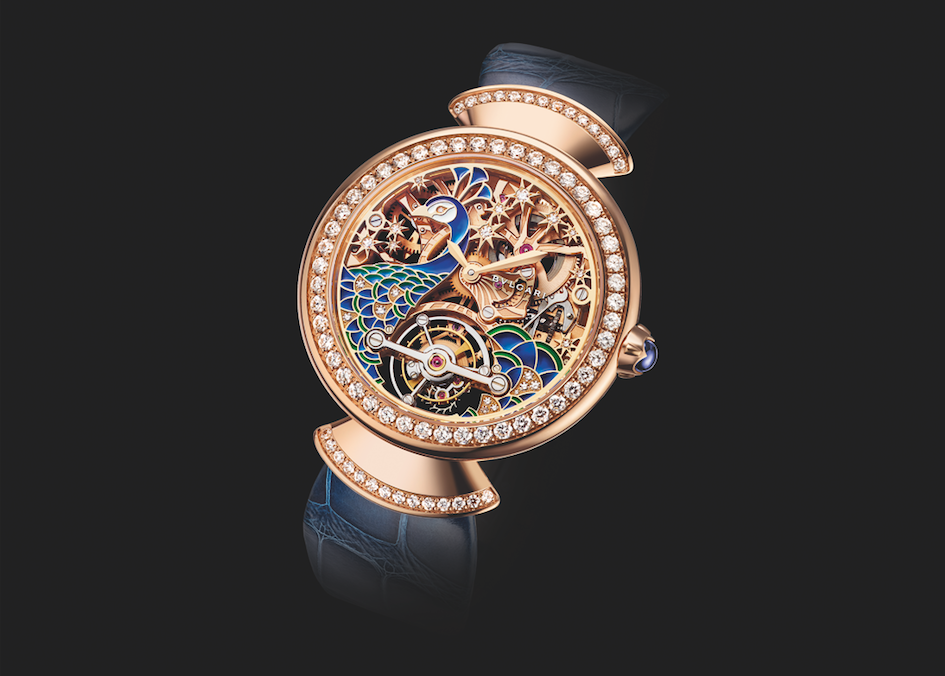 La segunda versión es una majestuosa representación del día que revela todo el esplendor del pájaro contra un delicado fondo de nácar, bajo las estrellas de diamantes. El oro rosado de la caja de 37 mm se complementa con una correa de piel de cocodrilo azul. Cada uno de estos relojes se embellecen con 135 diamantes siguiendo las tradicionales técnicas dominadas por Bulgari. Estas dos versiones son impulsadas por un movimiento mecánico de cuerda automática desarrollado por la Manufactura.