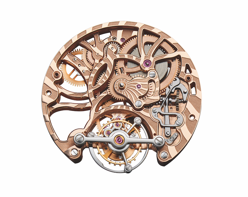 La tercera versión que igualmente exhibe al pavo real está animada por un movimiento mecánico aún más complejo y sofisticado: un calibre esqueletado con tourbillon. La poderosa atracción que este reloj ejerce sobre la imaginación proviene de la combinación dentro de un solo reloj de una complicación relojera importante, junto con habilidades artísticas excepcionales. Su combinación resalta la luz y la transparencia gracias a su movimiento totalmente aplanado. El engaste de los diamantes y los detalles pintados a mano del pavo real componen un todo unificado, dentro del cual esta ave majestuosa se convierte en una parte integral del movimiento que es claramente visible a través de los dos cristales zafiro. El resultado es el deleite de los conocedores, así como de quienes descubren este arte por primera vez.