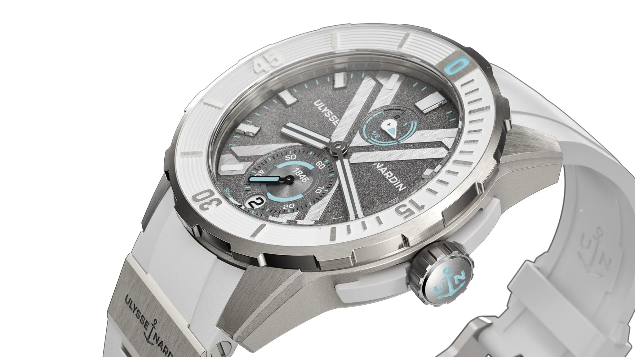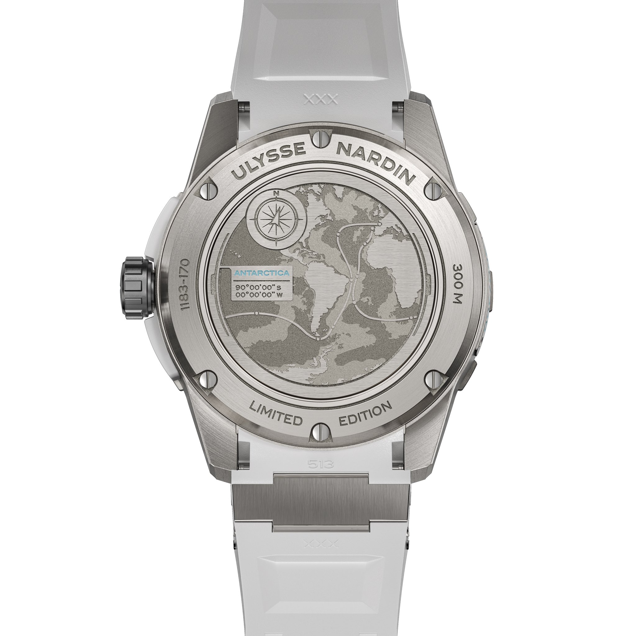 Desarrollado en estructura de titanio, la referencia luce insertos en caucho blanco a fin de replicar la estructura y colores de la Antártida. Mientras que sus toques azul hielo se inspiran en los glaciares de esta región. La carátula arenada y la correa a juego replican la esencia gélida, mientras que el fondo de la pieza exhibe las coordenadas de este sitio y un mapa grabados a láser, además de la ruta de la regata de vela Vendée Globe. De la cual Ulysse Nardin es Patrocinador Oficial.