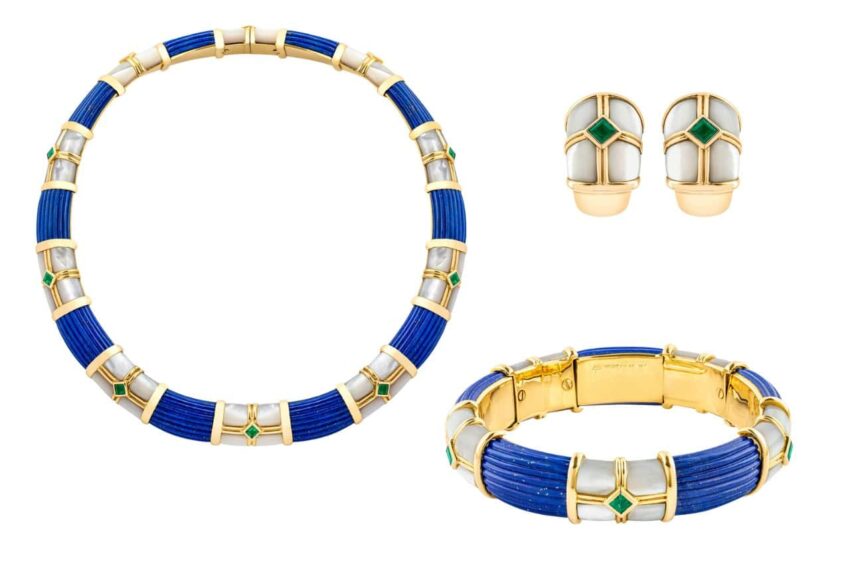 Envuelto por la luz cálida del oro amarillo, cobra una presencia protagónica en el collar y en la pulsera de la colección Divinité. Ambas piezas alternan segmentos de lapislázuli, nácar o madreperla y esmeraldas en corte princess. Una combinación de colores y poder vibratorio impresionante, ya que la esmeralda es particularmente valorada debido a su fuerza sanadora.