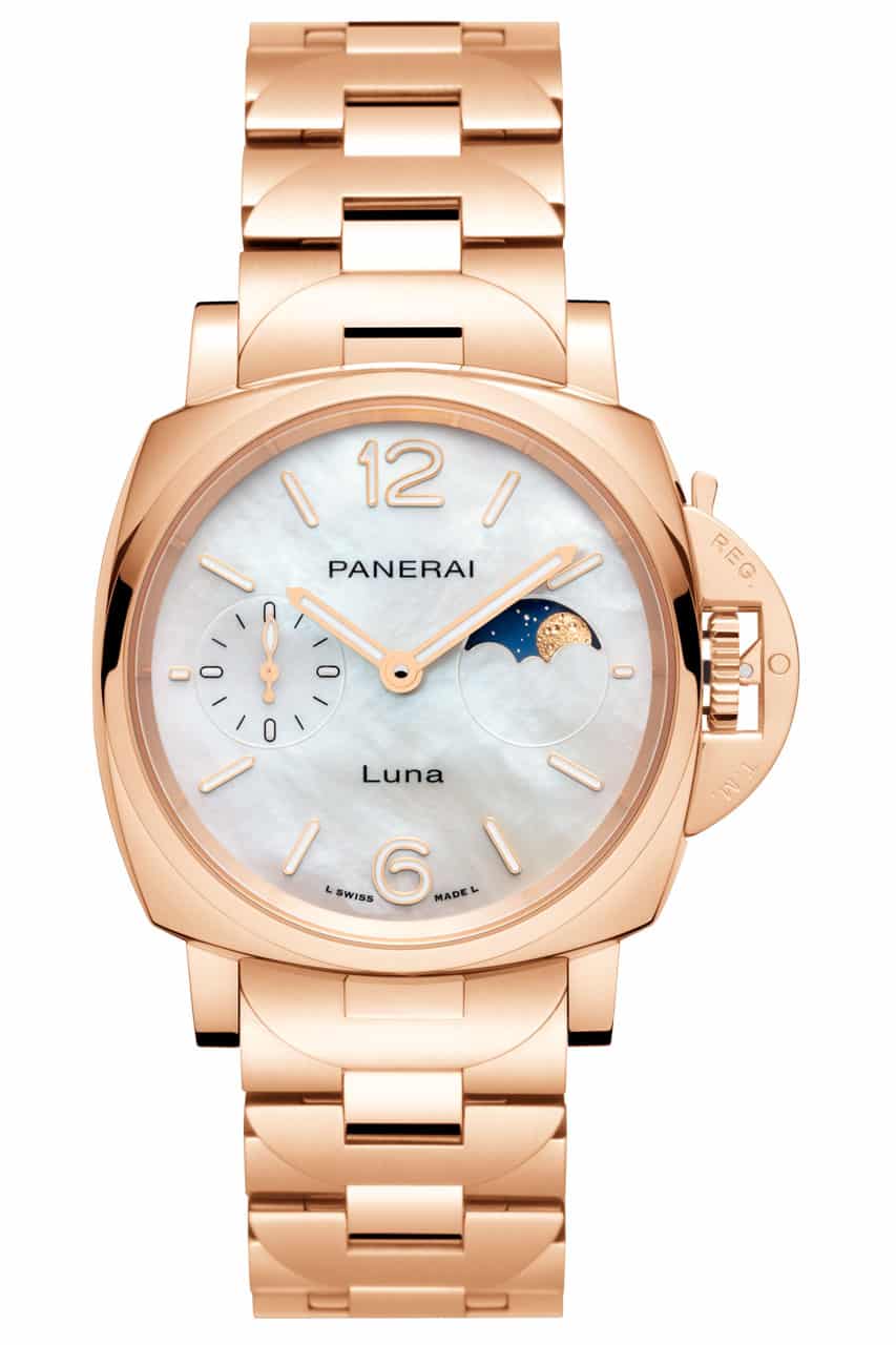 La caja de 38 mm también está fabricada en Goldtech™ y luce una esfera de nácar. La complicación de fase lunar, una de las más poéticas de la horología, es la pieza central del Luminor Due Luna TuttOro, nombre que rinde homenaje a “luna”, la palabra italiana para luna.