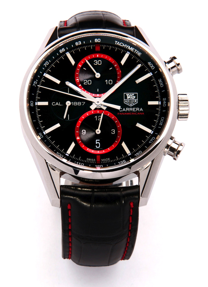 TAG Heuer CARRERA PAMAMERICANA Edición Limitada a 250 piezas // Movimiento: cronógrafo automático de manufactura / Calibre: 1887 con rueda de pilares y embrague vertical / Caja: 41 mm de acero pulido / Cristal: zafiro por ambos lados (fondo grabado con el logotipo de La Carrera Panamericana) / Carátula: negra con dos totalizadores para minutos y horas a las 12 y 6 h respectivamente / Frecuencia: 28, 800 a/h / Fuciones: horas, minutos y segundos (a las 9 h); cronógrafo y fechador a las 6 h; escala taquimétrica grabada en la carátula / Hermeticidad: 100 m / Correa: piel de cocodrilo con pespunte rojo / Edición Limitada a 250 piezas.