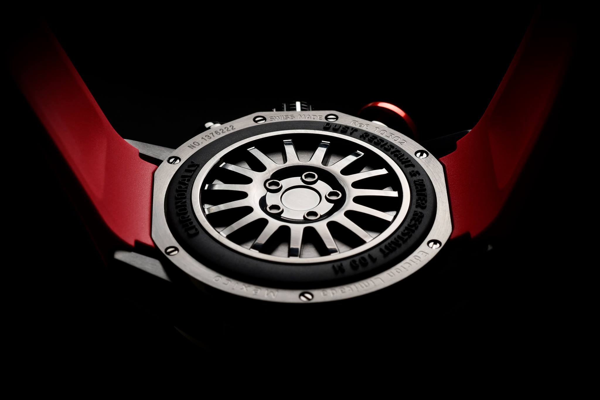 - Caja: 45 mm de diámetro, acero inoxidable con recubrimiento PVD y cristal de zafiro anti-reflejos; fondo de acero inoxidable diseñada en simulación a un rin sin birlos; corona con doble cierre y pulsador destacado con la inscripción MX