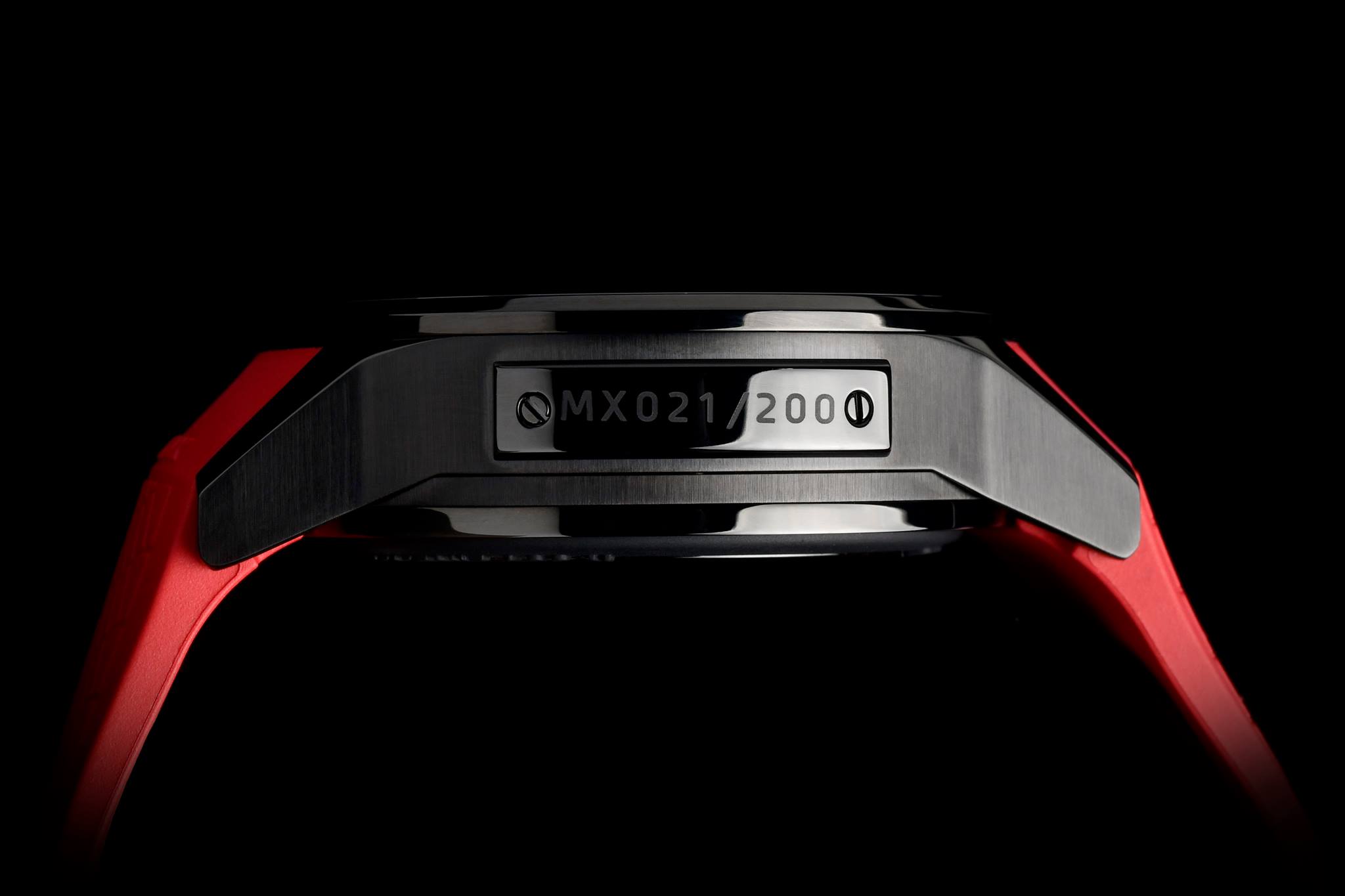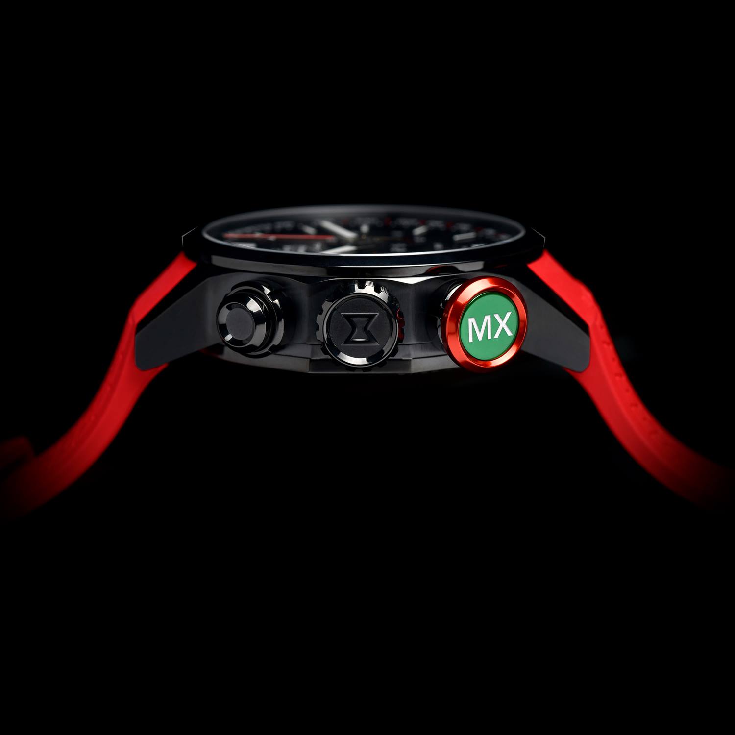 Desarrollado en acero inoxidable con recubrimiento PVD negro, la referencia posee un cristal de zafiro con tratamiento anti-reflejo y resistente a las ralladuras. Mientras que el icónico detalle de este cronógrafo incluye un pulsador de grandes dimensiones destacado con los colores verde y rojo, así como una abreviatura MX en alusión a la Limited Edition.