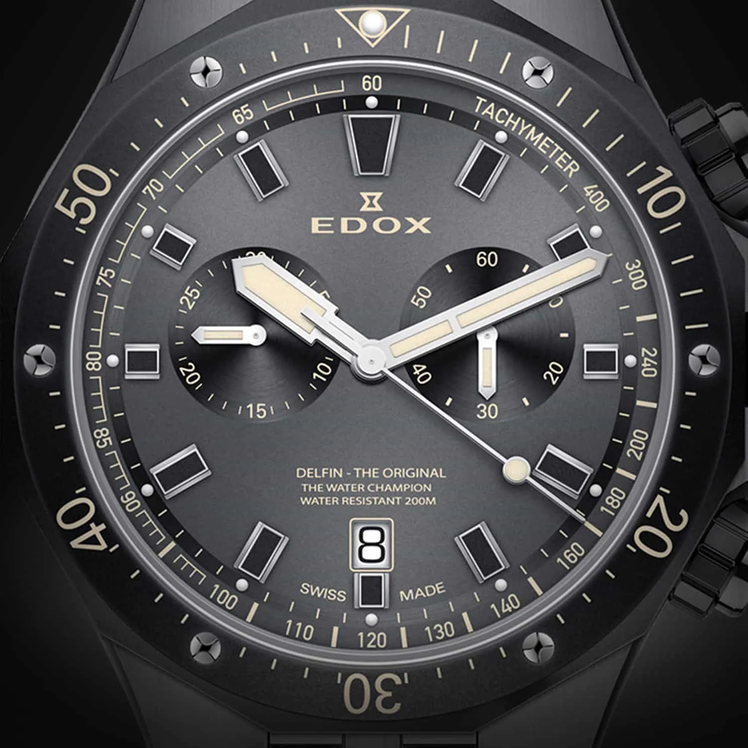 El reloj fue apodado The Water Champion debido a su resistencia al agua de 200 metros. Actualmente nos enfocamos al modelo de cronógrafo, Delfin The Original Chronograph, desarrollado en una caja de acero inoxidable de 43 mm de diámetro con recubrimiento PVD.