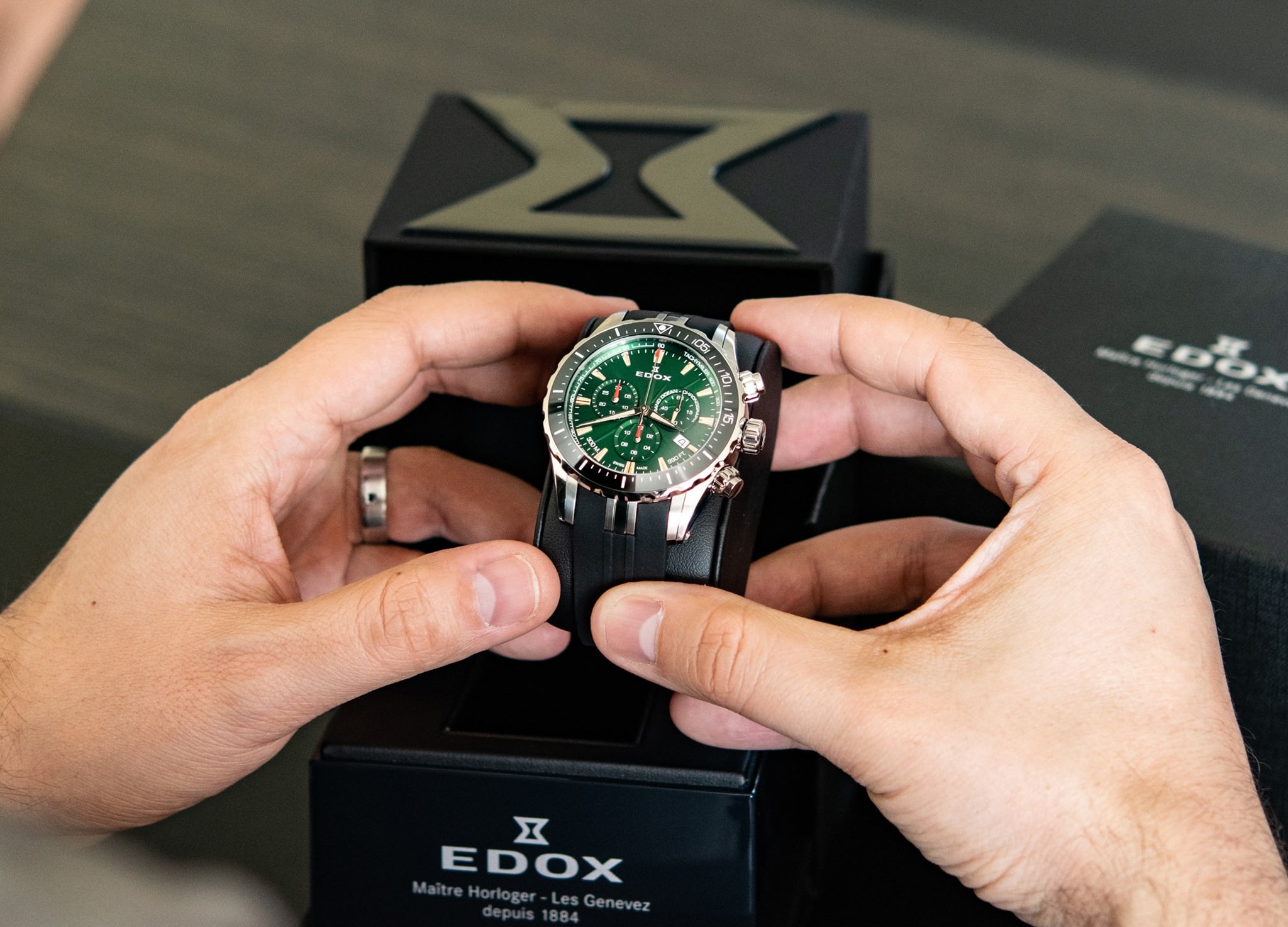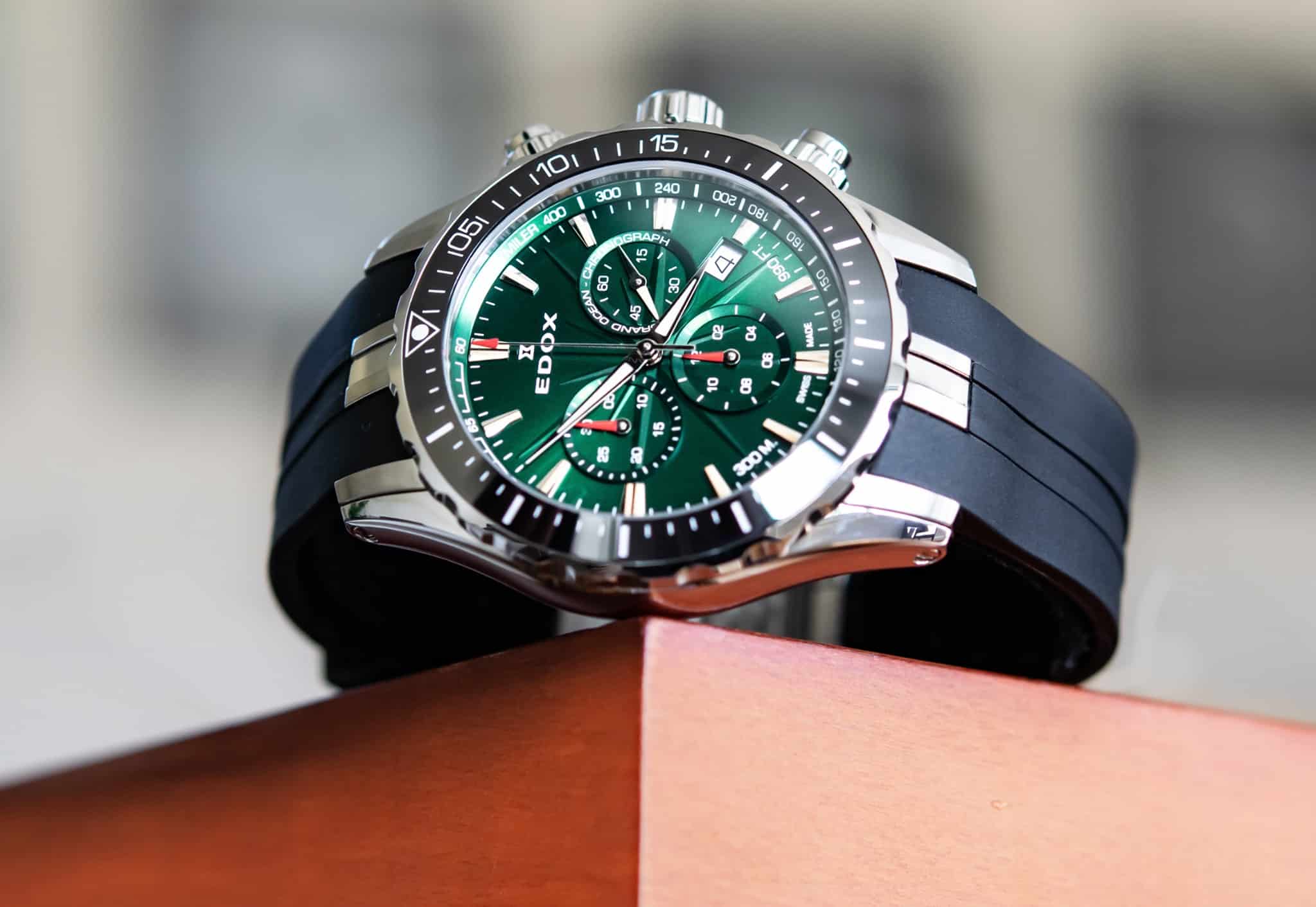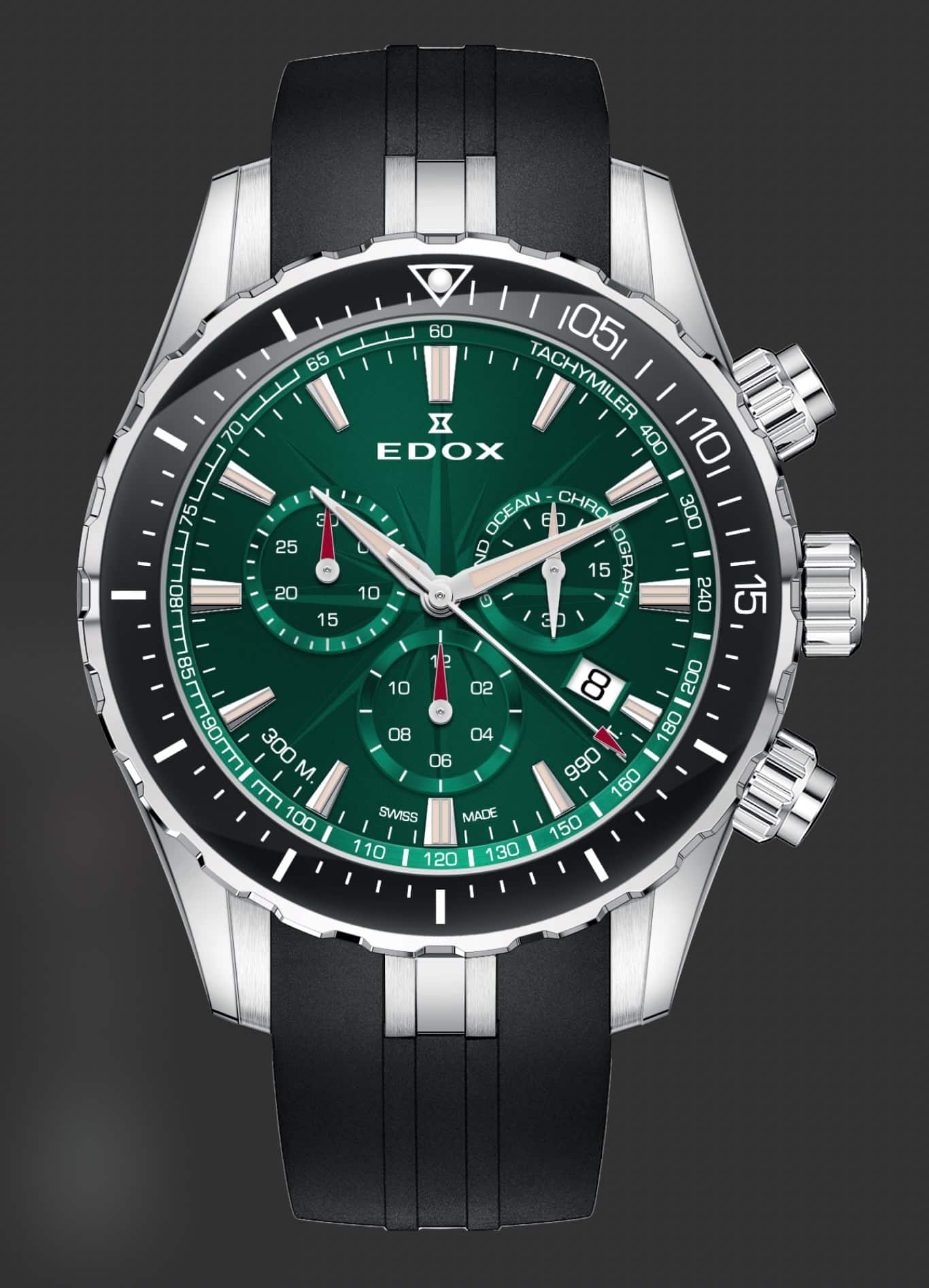 Inspirada en la navegación, este reloj con bisel giratorio y carátula verde es una atractiva propuesta para los apasionados de los deportes acuáticos y una excelente muestra de la artesanía de Edox.