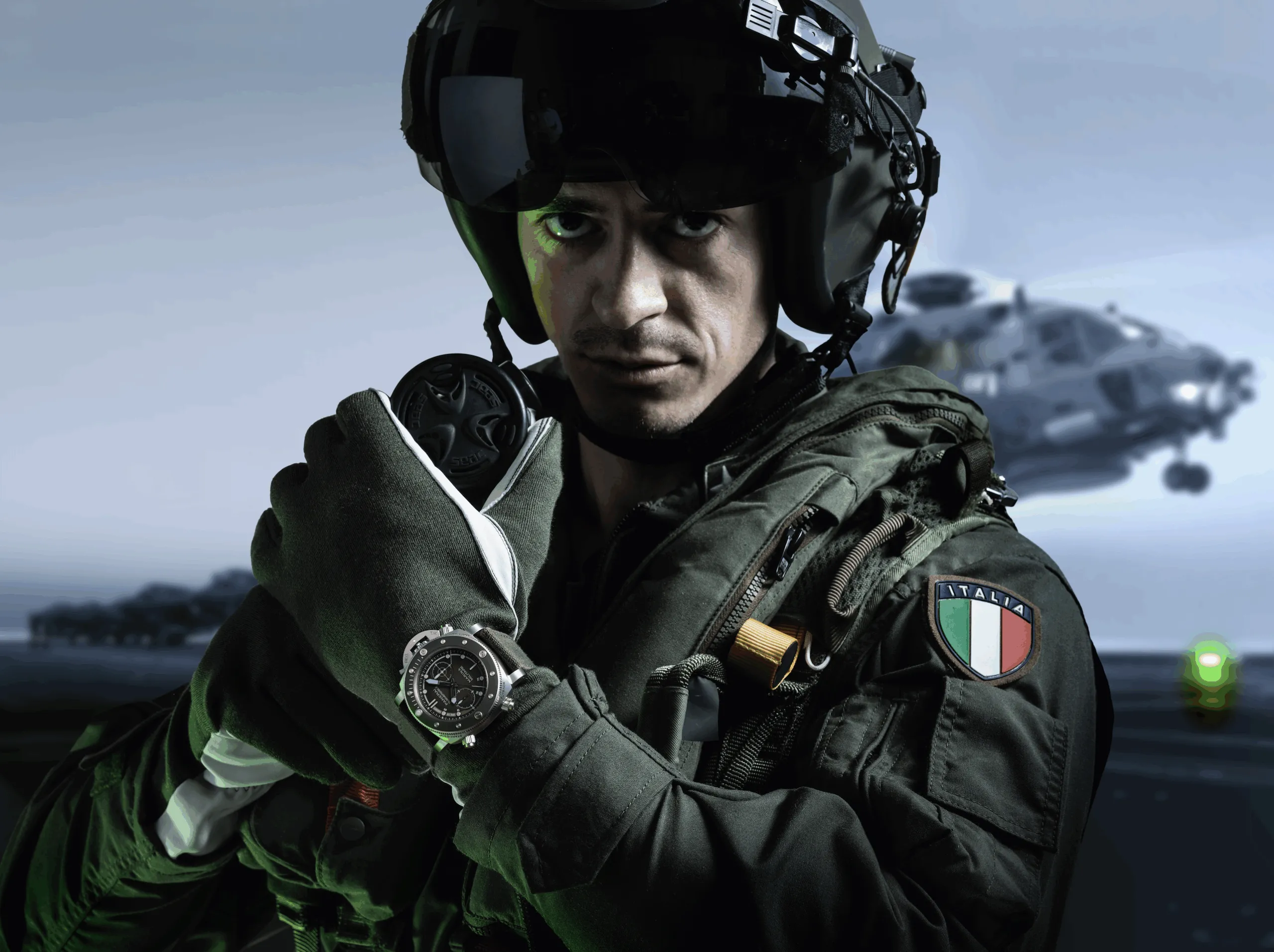 La legibilidad está garantizada por el uso de Super-LumiNova®. Completan su diseño una correa de lona verde militar con costuras a tono, y una segunda correa de caucho negro, pensada para misiones de buceo. El fondo de caja de titanio atornillado incluye por primera vez el emblema de alas de la Aviazione Navale.