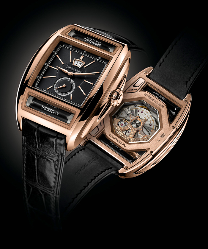 La lectura se da de la siguiente manera: horas y minutos por aguja de oro rosa o blanco macizo, gran fechador a partir de una apertura en la carátula en punto de las 12 h, segundero pequeño a las 6 h, mientras que un par de rodillos a las 12 y a las 6 horas marcan el mes del año y el día de la semana respectivamente.