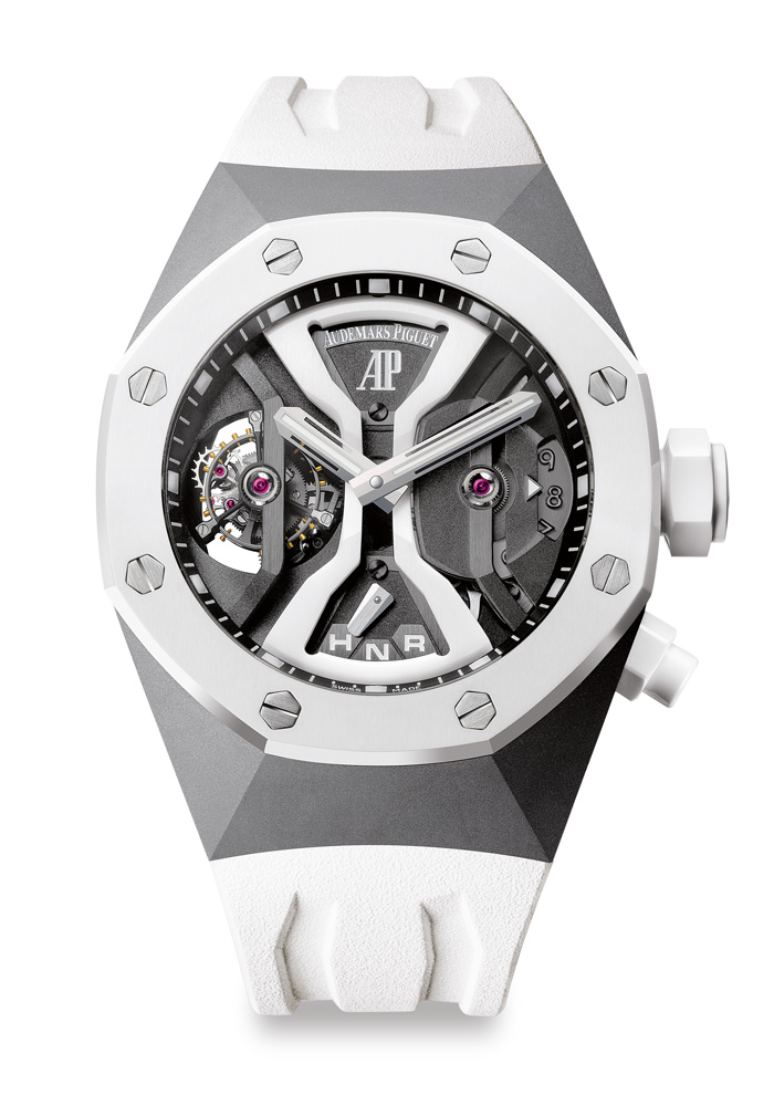 Royal Oak Concept GMT Tourbillon // Ref: RO 26580IO OO D010CA SDT / Movimiento: mecánico de cuerda manual / Calibre: 2930 / No. de piezas: 291; joyas: 29 rubíes / Reserva de marcha: 10 días (237 h) / Frecuencia: 3 Hz (21,600 a/h) / Caja: titanio / Cristal: zafiro por ambos lados / Bisel: cerámica blanca / Corona: atornillada / Hermeticidad: 100 m / Carátula: espueleada / Funciones: horas y minutos; segundo huso horario (GMT) a las 3 h e indicador de posición de la corona a las 6 h; selección de funciones e indicador día y noche, tourbillon de 60 seg a las 9 h / Agujas: Royal Oak y bisel interior de aluminio / Correa: caucho blanco con cierre desplegable de titanio