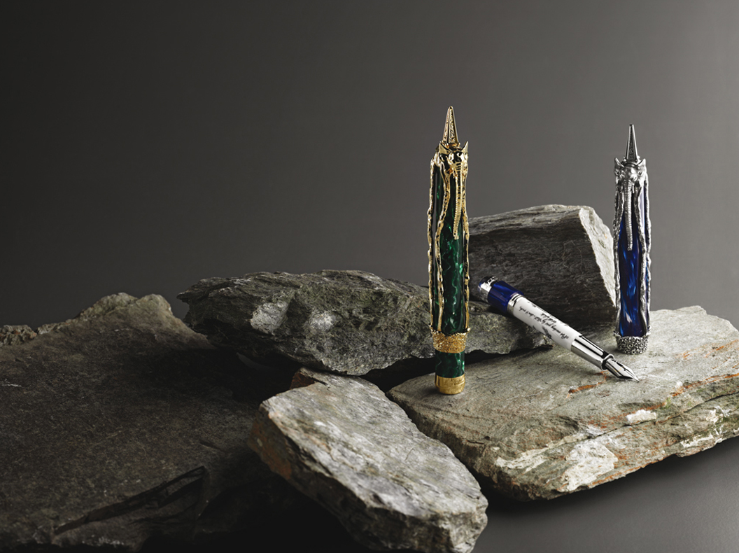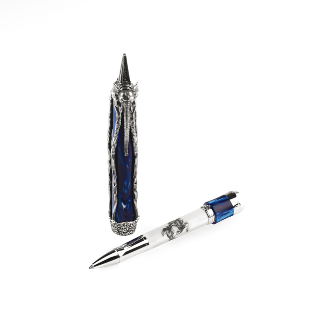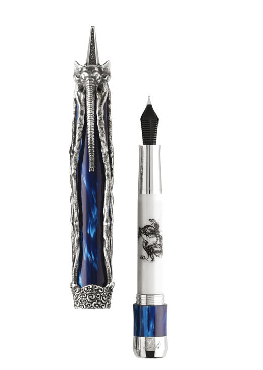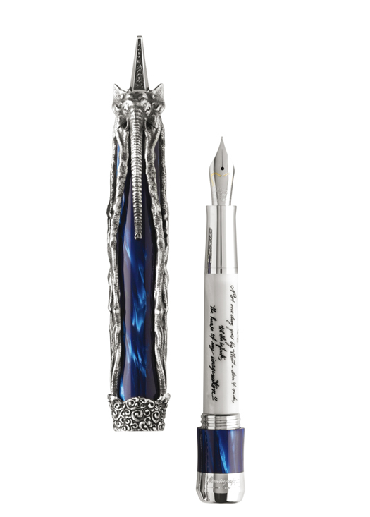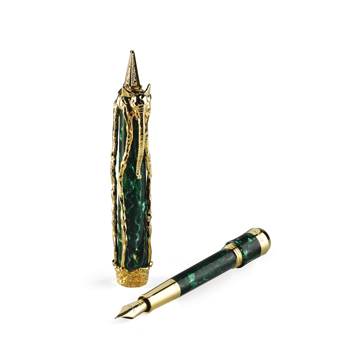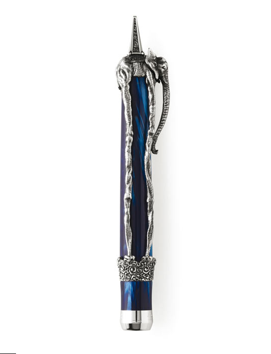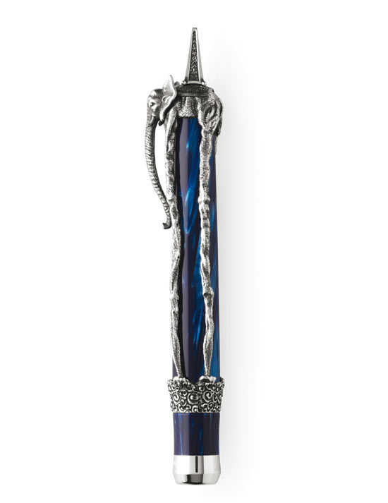 Los diseñadores de Montegrappa han transformado estos nobles animales, retratados con largas y delgadas patas. En la pluma de Dalí, el elefante abraza un barril de celuloide azul del Mediterráneo para la edición de plata, o de verde malaquita para la versión en oro macizo. Cuando se abre la pluma, una cita de la autobiografía, La vida secreta de Salvador Dalí, está inscrita en el barril interno de plata esterlina.