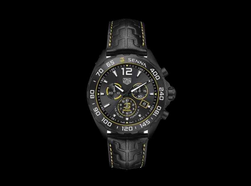 TAG Heuer Fórmula 1 Senna Edición Especial además de celebrar al histórico piloto, se convierte en un modelo más que celebra la pasión por el automovilismo. En primer lugar, vemos un brazalete negro de cuero en relieve, haciendo referencia al que Ayrton utilizaban en su muñeca. Su distintivo diseño en forma de S se complementa perfecto con costuras amarillas similares al casco que utilizaba Senna durante la competición.