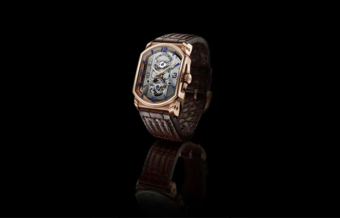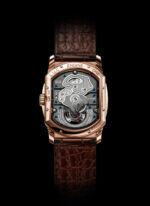 Montado sobre una correa de cocodrilo marrón, cosida a mano y rematada con cuatro refuerzos, a imagen de la guarnicionería clásica de los coches antiguos, ostenta una caja de oro rosa de 18 quilates, con una hermeticidad de 50 metros. Sus asas, ligeramente moldeadas, desplazadas y atornilladas, están perfiladas como alerones de coche. Aerodinámicas, y más bien ergonómicas, garantizan una perfecta comodidad al usuario y confieren a esta personal y elegante caja de 35.4mm por 44.4mm una presencia única.